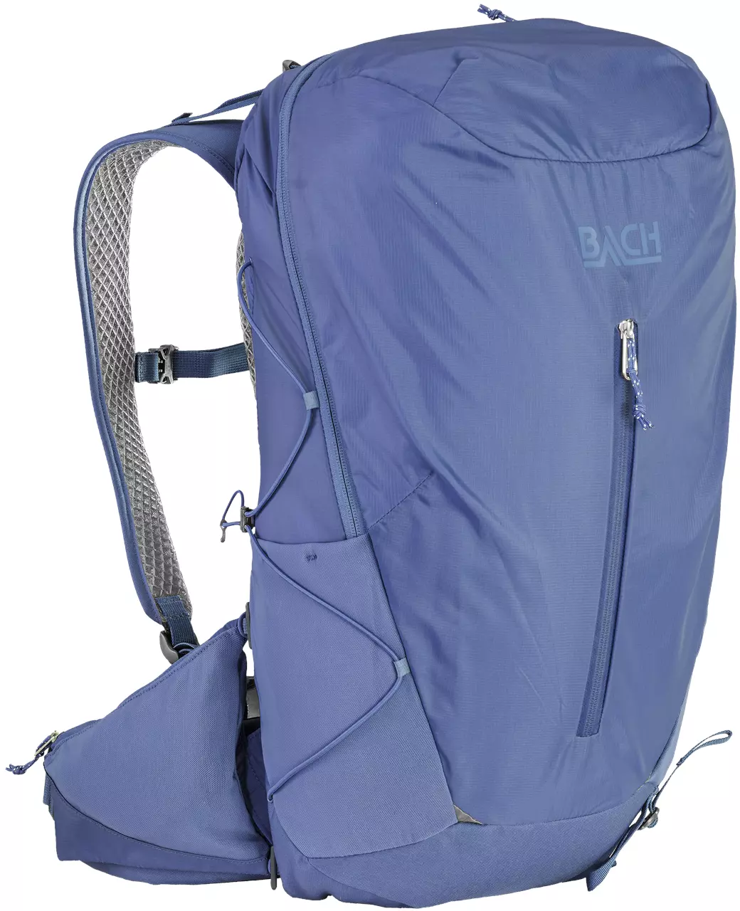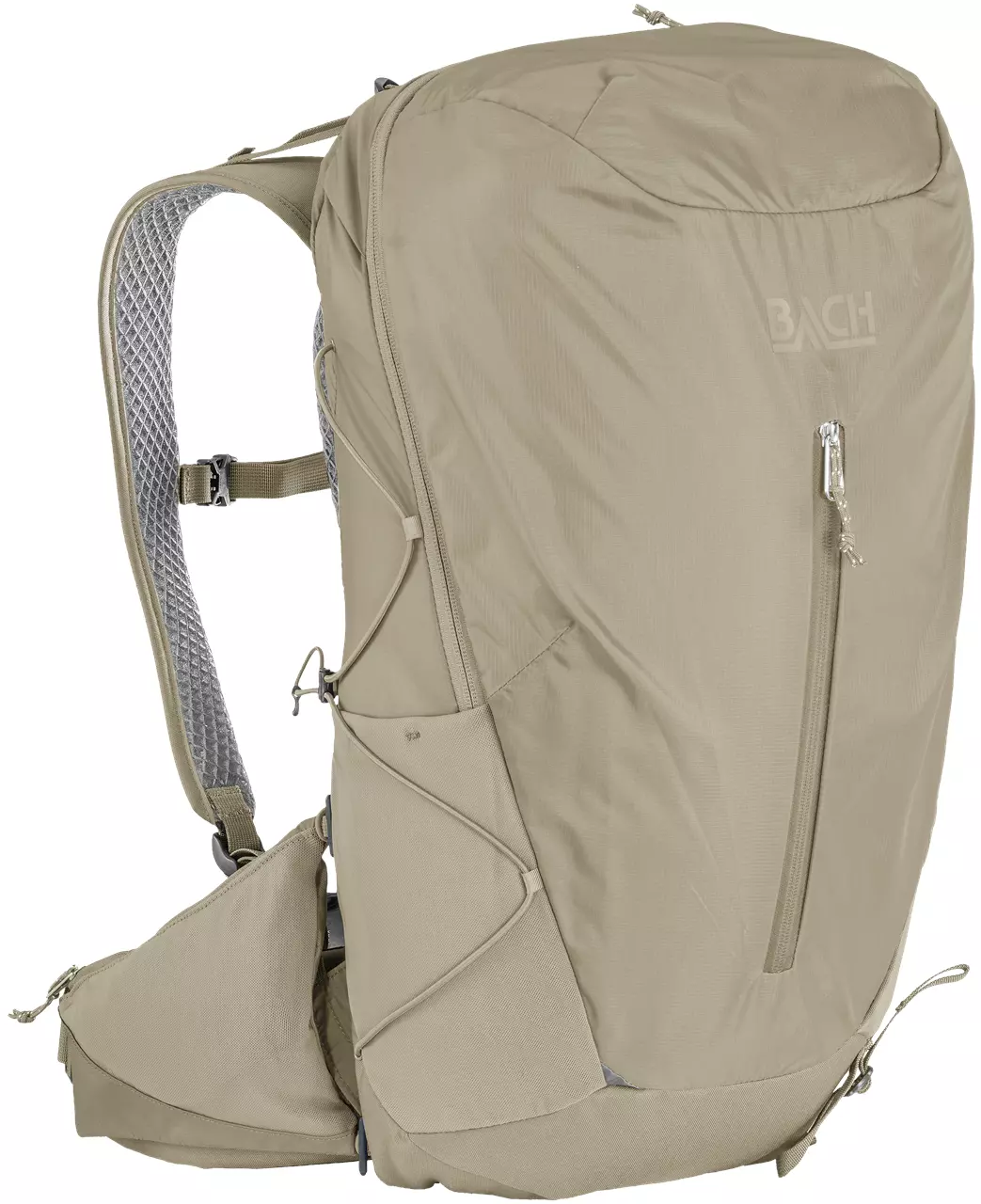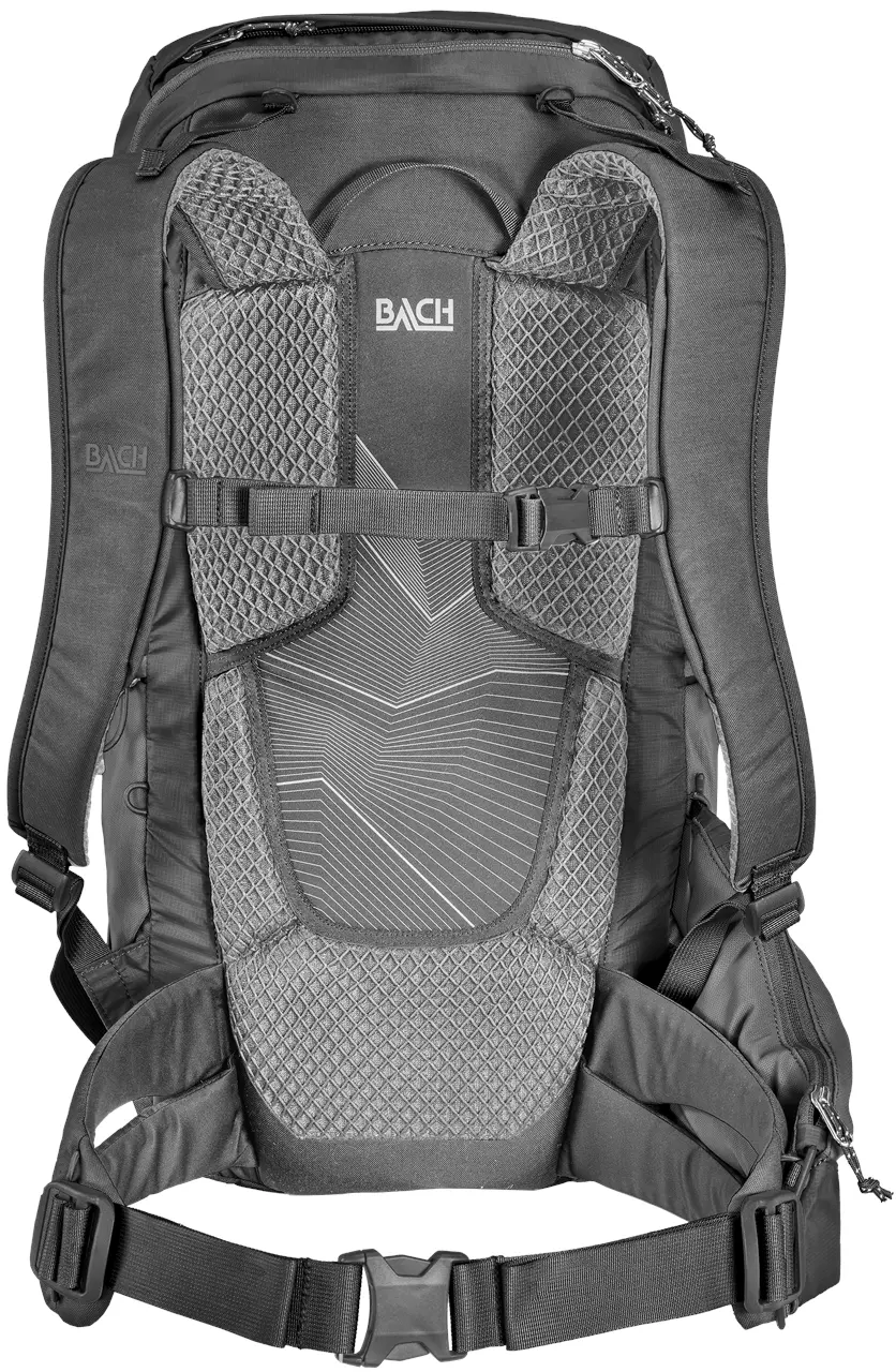 Der Shield 26L der irischen Rucksackdesigner von BACH ist ein moderner und vielseitiger Tagesrucksack. Er ist sowohl als Wanderrucksack als auch als Alltagsbegleiter für Uni, Arbeit oder zum täglichen Pendeln geeignet. Als Material verwendet BACH das leichte und zugleich sehr abriefeste Cordura®, was nochmals am Boden verstärkt zum Einsatz kommt. Der Rückenbereich ist gepolstert und mit einem zentralem Luftkanal und Air-Mesh zum Belüften ausgestattet. Der Shield 26 ist ein Toploader und lässt sich durch den sehr weit umlaufenden Reißverschluss komfortabel öffnen. Im Inneren befindet sich eine Tasche, die entweder für den Transport eines Laptops oder auch bei Wanderungen für Trinksysteme verwendet werden kann. Die zwei Seitentaschen aus Mesh sind ideal für das Mitführen von Trinkflaschen geeignet, während die geräumige Fronttasche mit Reißverschluss Stauraum für Kleinigkeiten bietet. Die Aussparung am Hüftgurt ist so konzipiert, dass er die Hüfte umschliesst, der obere Teil des Hüftgurts bequem auf dem Hüftknochen aufliegen kann und somit noch besser festsitzt. Ausserdem ermöglicht er die entsprechende Bewegungsfreiheit beim Gehen und vermindert Reibung und Druckpunkte auf der Hüfte. Der Hüftgurt wird dadurch zudem leichter, ohne dass der Komfort darunter leidet. Die Hüfttasche des Shield 26 ist abnehmbar.