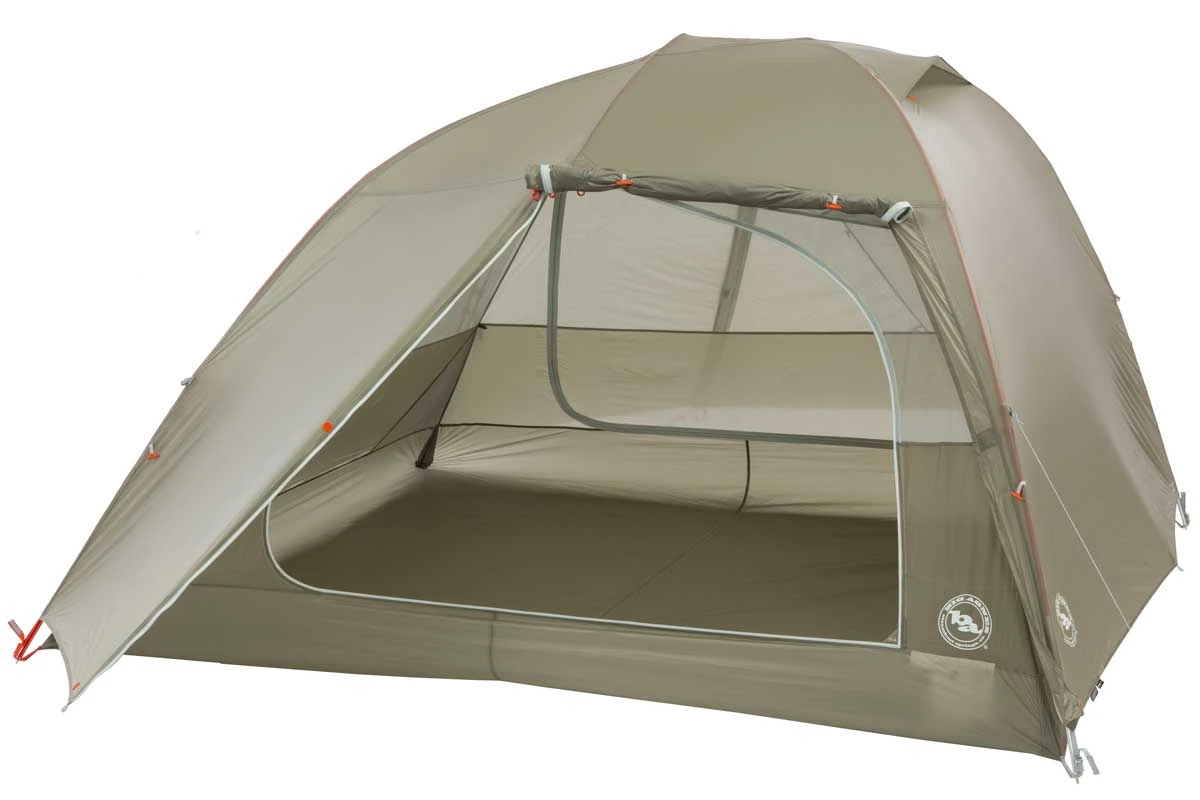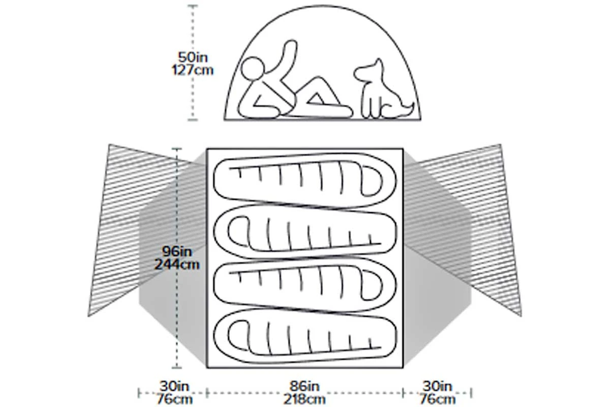 Familientauglich. Das Big Agnes Copper Spur HV UL 4 ist ein ultraleichtes Kuppelzelt, das perfekt ist für Touren, bei denen die komplette Ausrüstung für mehrere Tage im Rucksack oder in den Fahrradtaschen transportiert werden soll. Das Ultraleicht-Zelt bringt, schon inklusive der Zeltunterlage, die bei tapir-store im Lieferumfang enthalten ist, weniger als 3 kg auf die Waage. Es eignet sich damit hervorragend als ultra-mobiles Familienzelt, denn es fällt unterwegs kaum ins Gewicht, bietet aber viel Platz zum Leben, wenn es aufgebaut ist. Das ultraleichte Kuppelzelt, das neben zuverlässiger Wasserdichtigkeit auch eine gute Windstabilität mitbringt, macht alles mit – bis auf Winter. Für die vierte Jahreszeit ist das zum großen Teil aus Moskitonetz bestehende Innenzelt zu luftig, denn beim Big Agnes Copper Spur HV UL 4 stehen, wie bei jedem guten 3-Jahreszeiten-Zelt, optimale Belüftung und Minimierung von Kondensfeuchtigkeit im Vordergrund. Das erstklassige Raumangebot beim Big Agnes Copper Spur HV UL 4 beschränkt sich übrigens nicht auf die Grundfläche: Die High-Volume-Architektur (HV) mit vorgebogenen Gestängesegmenten beschert dem Innenzelt steile Wände und damit ein großzügiges Raumgefühl auch im Kopfbereich. Dazu kommen zwei durch das Außenzelt gebildete Vorräume an den Längsseiten des Leichtgewichtszeltes, in denen zusätzlich Ausrüstung gelagert und damit die Bewegungsfreiheit im Innenzelt verbessert werden kann. Beide Außenzelt-Türen lassen sich zu Vordächern aufstellen, die je nach Wetter als Schattenspender oder Regenschutz fungieren.