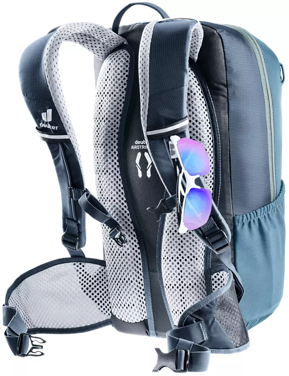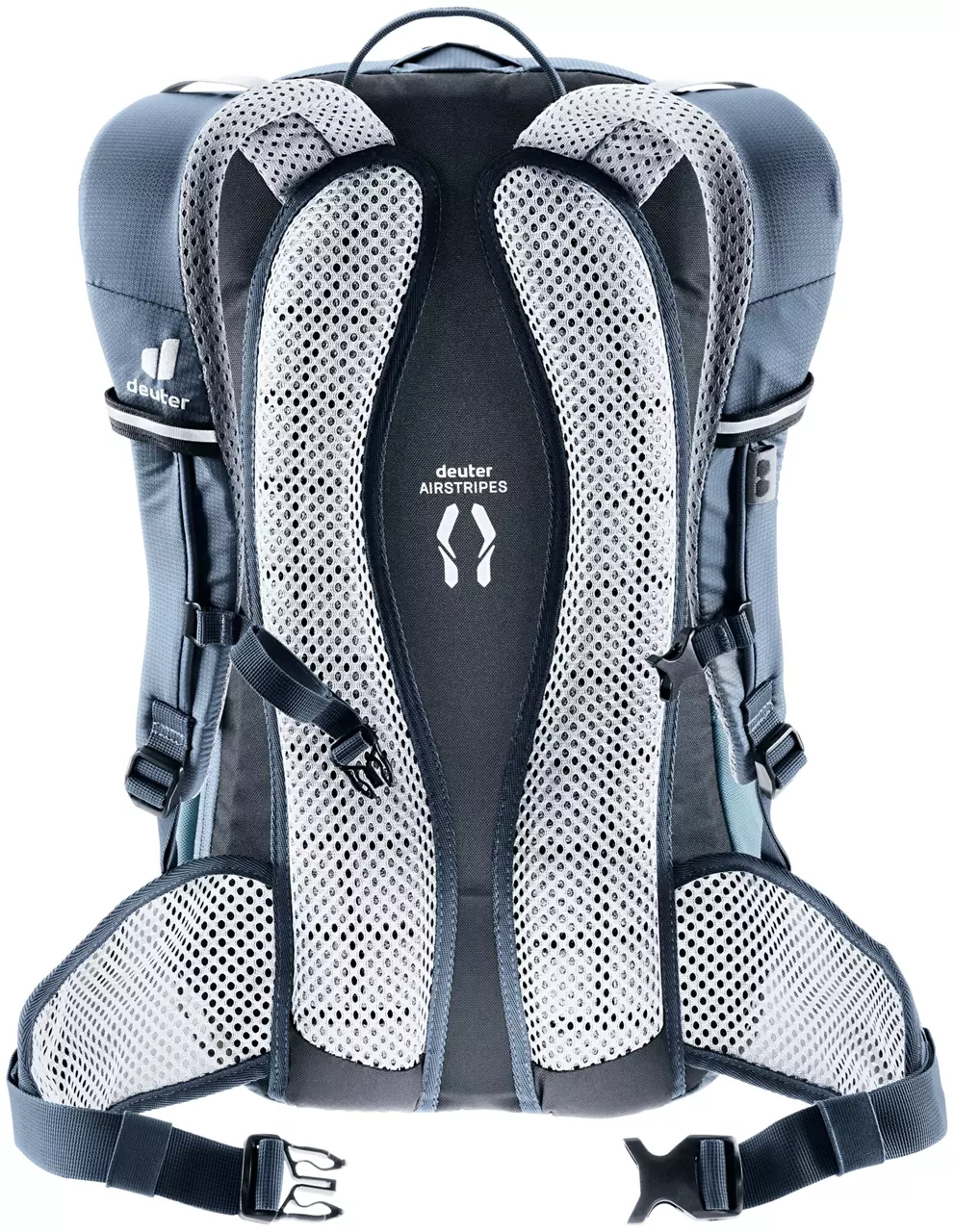 So unscheinbar der Deuter Bike I 20 auf den Blick auch aussehen mag: Er ist ein echtes Funktions- und Stauraumwunder. Der Fahrrad-Tagesrucksack bringt alles mit, was man von einem Bike-Pack erwartet. Der bewährte AIRSTRIPES-Rücken stabilisiert die Zuladung nah am Rücken, während die flexiblen Hüftflossen mit grobem Mesh für ein luftiges Tragegefühl sorgen. Das geräumige Hauptfach nimmt die Tagesverpflegung, zusätzliche (Regen-)Bekleidung und das Erste-Hilfe-Set auf, während das Frontfach mit seinen vielen Organizermöglichkeiten vor allem dafür gedacht ist, radspezifisches Equipment zu verstauen. Reifenheber, Tool, Ersatzschlauch & Co., aber auch Geldbörse und Schlüssel sind in diesem Fach schön aufgeräumt und sogar für die Luftpumpe gibt es eine spezielle Haltevorrichtung. Ein Highlight ist die große Reißverschlusstasche an der Rückseite des Bike I 20, die einen schnellen Zugriff auf das Smartphone oder die Radkarte erlaubt, ohne den Rucksack hierfür abnehmen zu müssen. Auch toll: Als Rückenversteifung dient ein EVA-Panel, das allerdings auch mit wenigen Handgriffen entnommen werden kann – und so erhält man gleich ein Sitzkissen für die Pause! Eine elastische, verstaubare Helmhalterung, seitliche Flaschentaschen, Reflektoren, Trinksystem-Vorbereitung und eine abnehmbare Regenhülle vervollständigen den Bike I 20. Übrigens: Konzipiert ist dieser Tagesrucksack zwar für Radtouren, aber auch auf Ausflügen zu Fuß oder als Begleiter für jeden Tag macht er eine souveräne Figur!