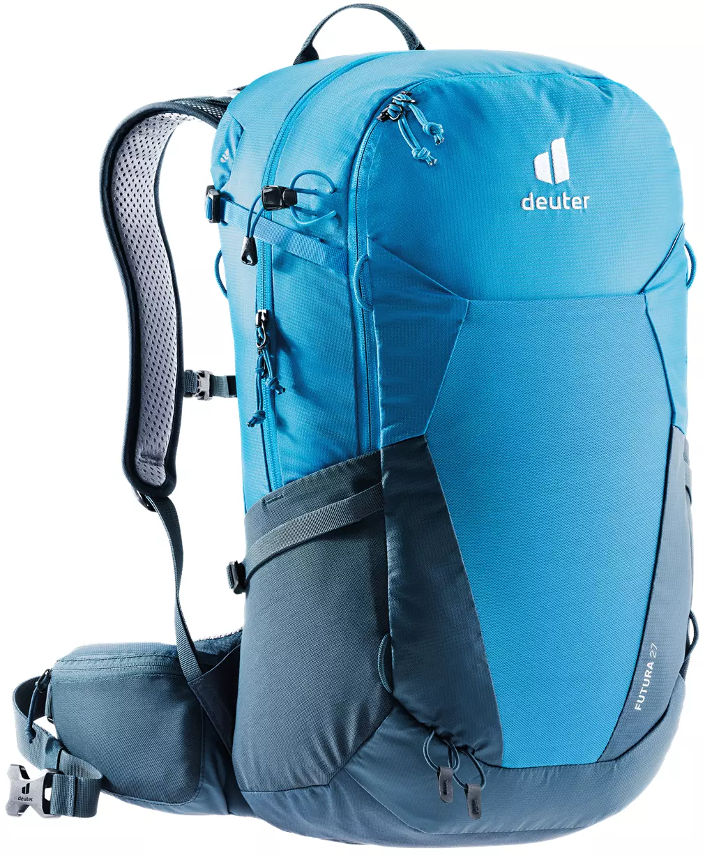 Der Futura 27 von Deuter ist ein äußerst bequem zu tragender Wanderrucksack von Deuter, der mit hervorragender Rückenbelüftung und einer vielfältigen Ausstattung überzeugen kann. Das ist vor allem auf das Tragesystem Aircomfort Sensic zurückzuführen, bei dem über einen elastischen Federstahlrahmen ein Netzrückensystem gespannt ist. Dies reduziert die Schwitzfeuchte am Rücken merklich. So ist der Futura 27 bestens geeignet für Genießer-Tagestouren, Klettersteige oder Wochenend-Hüttentouren. Das Packfach des Deuter-Dackpacks – von oben oder über den U-förmigen Frontreißverschluss zugänglich –, Seitentaschen und eine elastische Fronttasche (Nasswäschefach) bieten maximale Übersicht und schnellen Zugriff auf den Rucksackinhalt. Die integrierte Regenhülle bietet perfekten Nässeschutz, denn schließlich gilt: Gut ausgestattet macht eine Tour auch bei Regenwetter Spaß!
