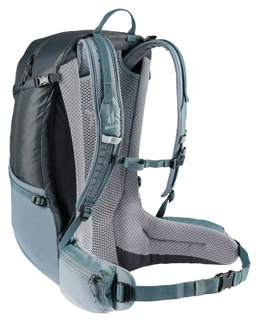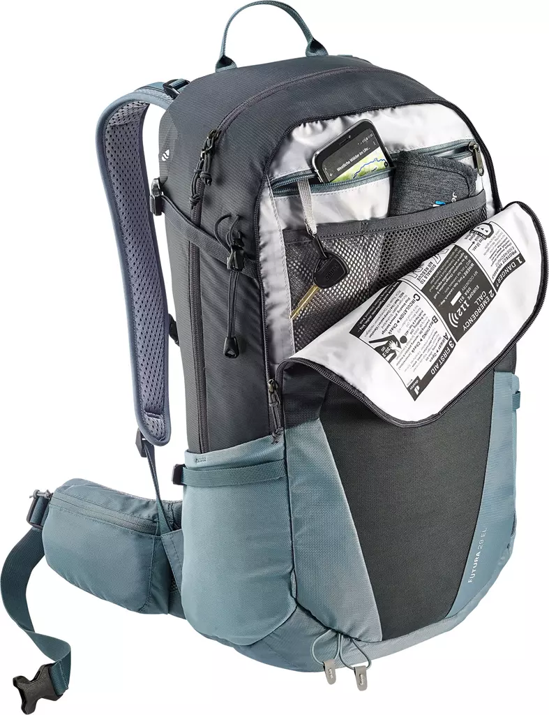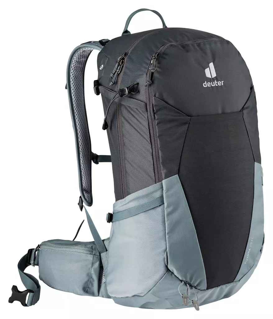 Der Futura 29 EL von Deuter ist ein äußerst bequem zu tragender Wanderrucksack von Deuter, der mit hervorragender Rückenbelüftung und einer vielfältigen Ausstattung überzeugen kann. “EL” steht dabei für “extra lang”, das heißt, dass Rucksackmodelle dieser Serie besonders ideal für großgewachsene Menschen (ab 1,85 m) sind, denn sie haben im Vergleich zu den anderen Varianten einen 6-9 cm längeren Rücken. Das gute Tragegefühl des Daypacks ist vor allem auf das Tragesystem Aircomfort zurückzuführen, bei dem über einen elastischen Federstahlrahmen ein Netzrücken gespannt ist. Dies reduziert die Schwitzfeuchte am Rücken merklich. So ist der Futura 29 EL bestens geeignet für Genießer-Tagestouren, Klettersteige oder Wochenend-Hüttentouren. Zwei über einen Reißverschluss zugängliche Packfächer – davon eins mit großem Organisationsteil -, Seitentaschen und eine elastische Fronttasche (Nasswäschefach) bieten maximale Übersicht und schnellen Zugriff auf den Rucksackinhalt. Die integrierte Regenhülle bietet perfekten Nässeschutz, denn schließlich gilt: Gut ausgestattet macht eine Tour auch bei Regenwetter Spaß!