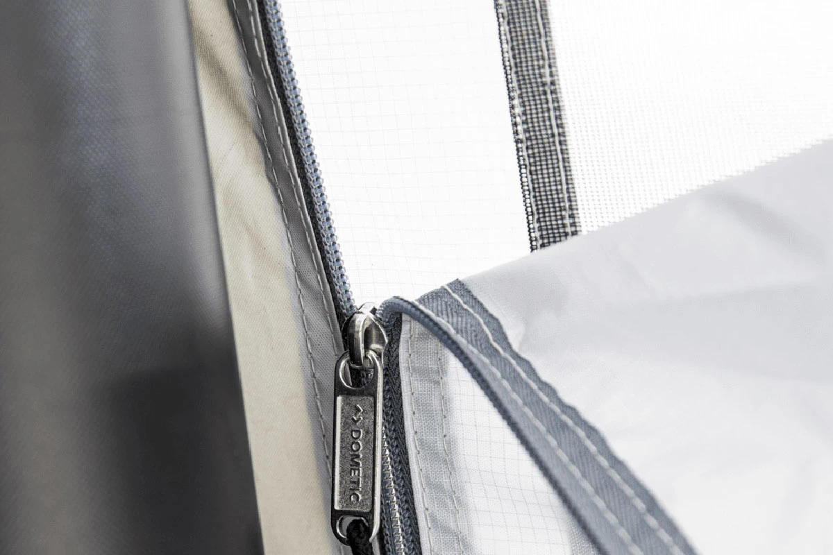 Dometic hat das Auto Air Redux mit einem Rahmen aus großzügig dimensionierten Luftschläuchen versehen, der die Konstruktion freistehend macht und so automatisch auch die Drive-Away-Funktionalität des Vorzeltes unterstützt. Diese wird komplettiert durch die rundum verschließbare Schleuse sowie die stabilen Abspanngurte mit denen das Zelt auch ohne Befestigung am Auto sehr sicher im Wind steht. Mit seinen senkrechten Seitenwänden, viel Kopffreiheit sowie die durch abdeckbare Moskitonetzfenster jederzeit gewährleistete Frischluftzufuhr bietet das Auto Air Redux viel Wohnkomfort. Das 150 Denier dicke Material bietet sichert nicht nur hohen Wetter- und UV-Schutz – es flattert auch nicht im Wind und garantiert so ruhigen Schlaf, wenn man das optionale 2-Personen-Innenzelt, das Dometic für das Auto Air Redux anbietet, als Schlafkabine verwendet. Soll das Vorzelt eher Fahrradgarage als Wohn- oder Schlafzimmer sein, lässt sich die robuste Bodenwanne, die mittels Reißverschluß am Zelt befestigt ist, einfach entfernen.