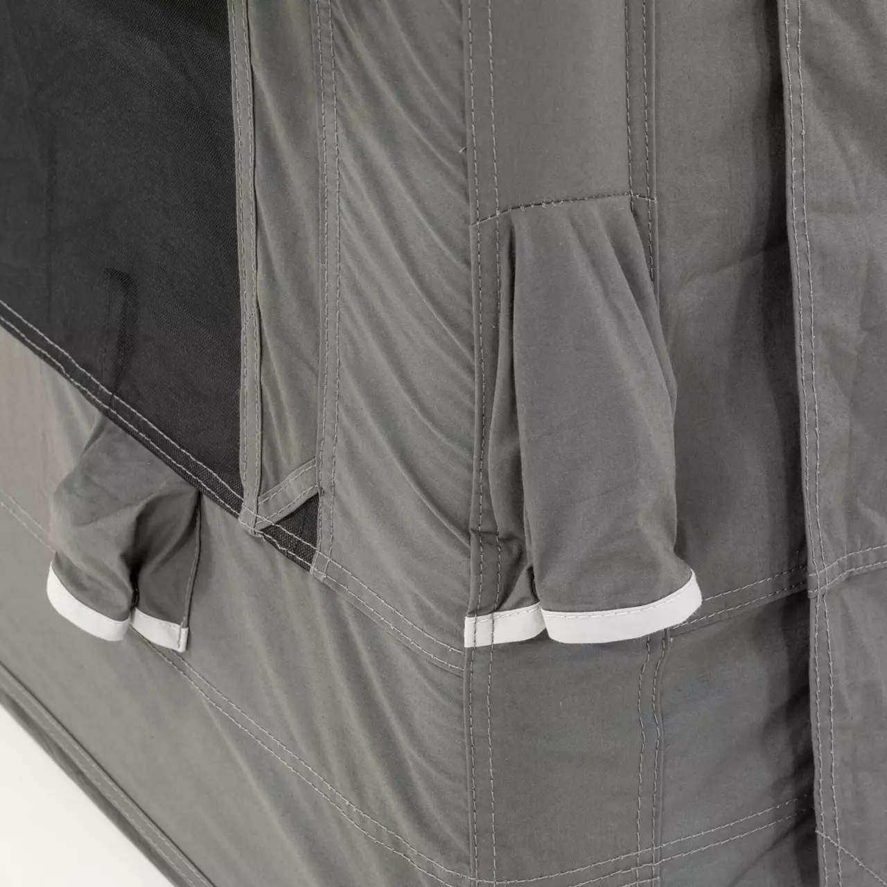 - Wetterschutz-Dächer über beiden, mit Moskitonetz ausgestatteten Zeltgiebeln