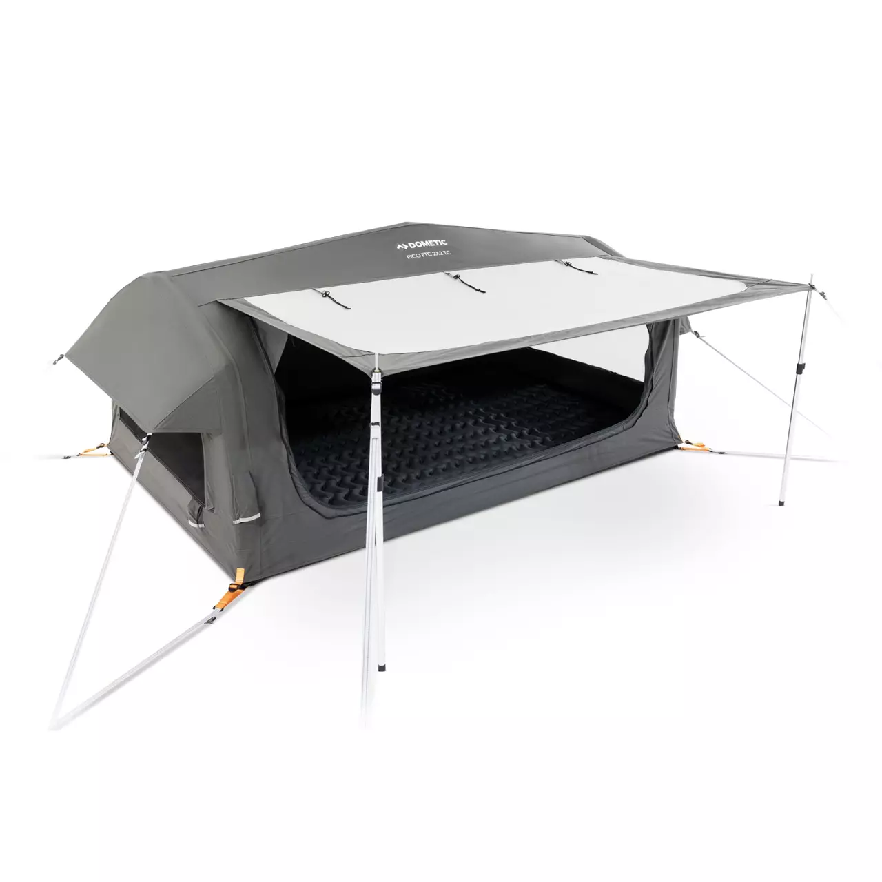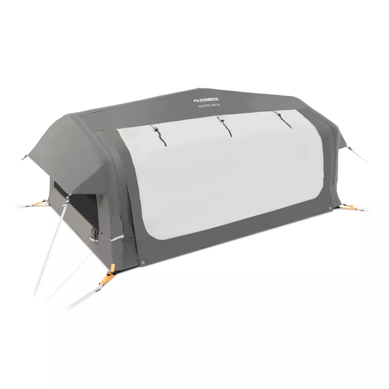 Tolle Kiste: Die vier senkrechten Wände des Dometic Pico FTC 2×2 TC stehen auf einem Zeltboden, in den eine Luftmatratze integriert ist! Das kleine, freistehende 2-Personen-Zelt wird von Luftschläuchen getragen und Dometic hat diese Idee einfach konsequent zu Ende gedacht! Damit der Luftdruck im Zeltgerüst und der in der Schlafmatte getrennt geregelt werden können, ist es selbstverständlich erforderlich, die mitgelieferte effiziente Doppelhub-Kolbenpumpe beim Aufbau zwei Mal anzusetzen. Aber selbst mit Umstecken von Ventil zu Ventil ist die wettergeschützte Schlafstatt nach 5 Minuten einsatzbereit. Also gut: die beiden Schlafsäcke müssen zum Schluß noch ausgerollt werden auf der komfortabel 215 x 140 cm großen Grundfläche des Pico FTC 2×2 TC. Dometic hat als Material für das robuste Kuppelzelt atmungsaktives, unbeschichtetes Baumwoll-Polyester-Mischgewebe gewählt und zusätzlich beide Giebel mit großen, wettersicher überdachten Moskitonetzflächen ausgestattet. Mit diesen konstruktiven Details erreichen die Camping-Profis die Eindämmung von Kondensfeuchtigkeit im Inneren des Pico FTC 2×2 TC auf ein absolutes Minimum. Bei gutem Wetter kann zusätzlich die Tür des kleinen Kuppelzeltes komplett zum Vordach aufgestellt und der Eingang nur mit Moskitonetz geschützt werden. Die teleskopierbaren Stangen zur Verwandlung der Tür in ein Vordach sind im Lieferumfang enthalten. Durchdacht ist auch die Packtasche des Dometic-Campingzeltes: Sie ist mit Rucksackträgern versehen und kann so komfortabel ein gutes Stück getragen werden, wenn bei einer Spontanübernachtung der optimale Zeltplatz mal nicht unmittelbar neben dem Fahrweg liegt. Das Packmaß des zusammengerollten Pico FTC 2×2 TC ist, inklusive Luftmatratze, so freundlich, dass es auch im kleinsten Auto immer noch einen Platz findet und die sommerliche Spritztour deshalb niemals von der täglichen Suche nach Übernachtungsquartieren dominiert werden muss.