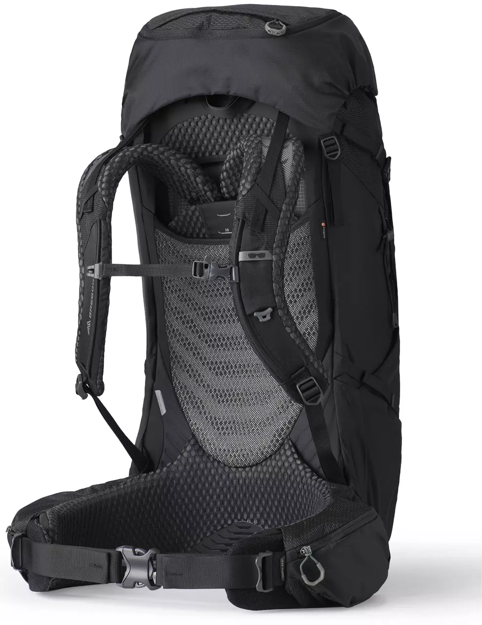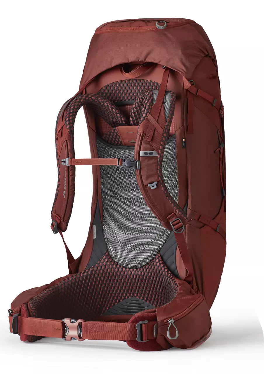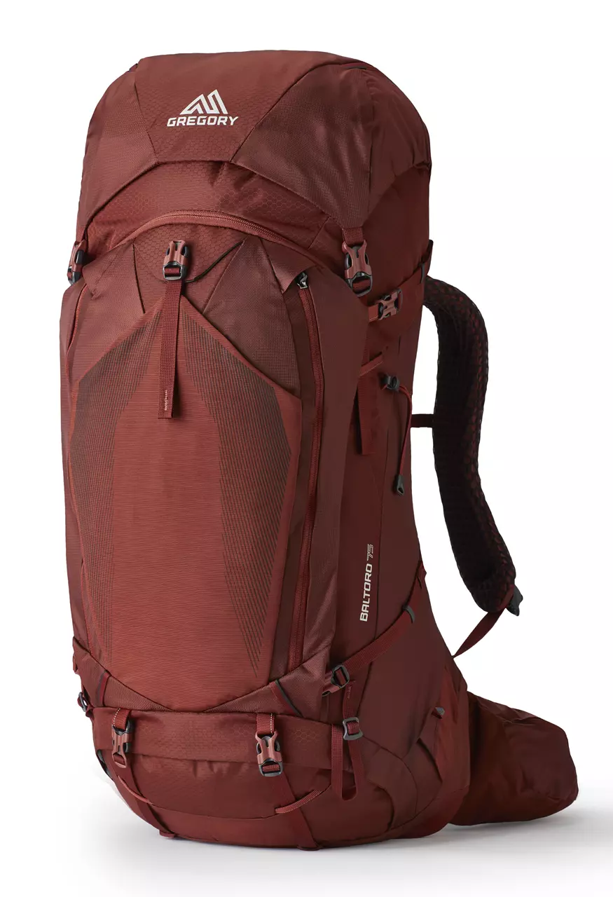 Der Baltoro 75 von Gregory ist ein hervorragend ausgestatteter Trekkingrucksack für ausgedehnte Touren mit viel Gepäck. Das Response-A3-Tragegestell mit einem Hohl-Aluminiumrahmen ist besonders leicht und sorgt gleichzeitig für Stabilität. So ist das Tragen auch größerer Lasten problemlos möglich, empfohlen werden bis zu 25 Kilogramm Zuladung. Der schlank geschnittene Rucksack sitzt nah am Rücken. Dank von Netzmaterial umschlossenem Matrixschaum liegt das Rückenteil besonders angenehm an, wobei weiterhin ein hervorragendes Feuchtigkeitsmanagement gewährleistet wird. Auch bei anstrengenden Wegabschnitten trocknet das Material schnell und der Rücken bleibt gut belüftet. Die gut gepolsterten Schulter- und Hüftgurte passen sich automatisch an die jeweiligen Bedürfnisse an und sind zusätzlich einstellbar, sodass sich das gesamte Tragesystem an jeden Rücken anschmiegen kann. Schulter- und Hüftgurte sind beweglich gelagert und erlauben ein dynamisches Laufen. So lassen sich herausfordernde Touren entspannt genießen. Auch die sonstige Ausstattung des Baltoro 75 lässt keine Wünsche offen. Das 210D Nylon ist überaus widerstandsfähig und kann auch eine robuste Handhabung vertragen. Zum Schutz der Ausrüstung vor nassem Wetter legt Gregory eine Regenhülle bei. Seitliche Stretch-Taschen bieten Platz für Trinkflaschen, Wasserfilter oder andere Utensilien, die schnell griffbereit sein sollen. Der besondere Sidewinder-Flaschenhalter hält die Trinkflasche sicher an Ort und Stelle, auch wenn man sich mal vornüberbeugt. Durch den umlaufenden Frontreißverschluss wird das Ein-, Aus- oder Umpacken deutlich erleichtert und eine Fronttasche mit Reißverschluss bietet Platz für Dinge, die unterwegs gut erreichbar sein oder nach einem Regenguss trocknen sollen. Auch ein abtrennbares Bodenfach, eine Pickelhalterung oder Befestigungsschlaufen lassen nicht auf sich warten. Am Schultergurt lässt sich die Sonnenbrille bei Bedarf befestigen. Die Hüfttaschen, von denen eine sogar wettergeschützt ist, sind an die Größe moderner Smartphones angepasst, sodass sich die Reißverschlüsse besser schließen lassen. Bei all dem Funktionsumfang und dem reichlichen Volumen bringt der Baltoro 75 trotzdem nur 2,19 kg Eigengewicht auf die Waage. Rundum gelungener Trekkingrucksack also für alle, die gern sehr lange unterwegs sind oder aufgrund einer autarken Reiseweise, bei der auch die Tourenverpflegung noch Platz finden muss, ein großes Volumen benötigen.