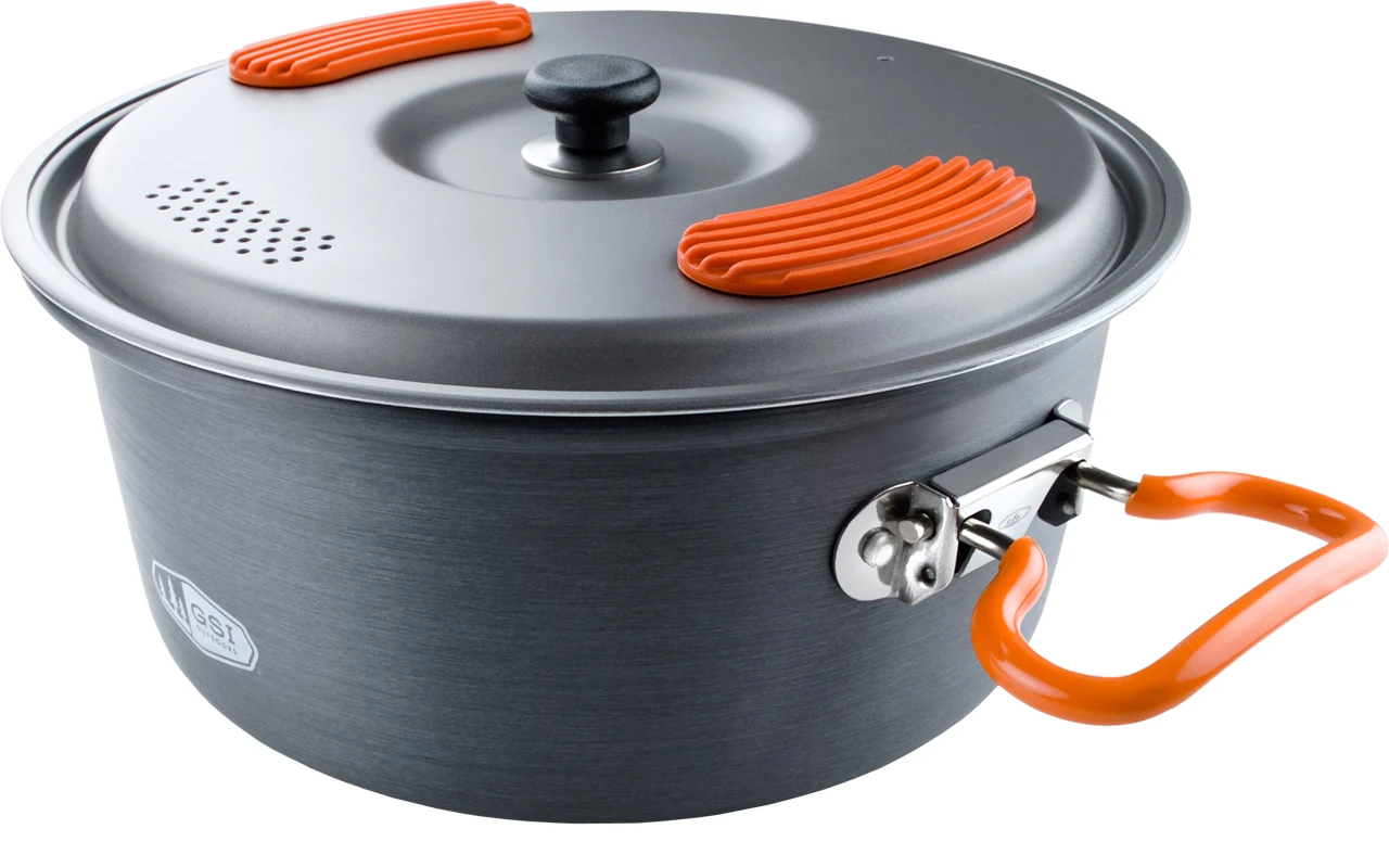 Großes Fassungsvermögen und kleines Gewicht sind bei einem Topf für das Outdoor-Abenteuer oberstes Gebot. GSI Outdoors hat mit dem Halulite 2.0L Pot die passende Antwort. Der Topf aus hartanodisiertem Aluminium wiegt 405 Gramm und bietet 2,0 Liter Fassungsvermögen. Damit sollten die Nudeln für 2-3 hungrige Mäuler locker zum Kochen gebracht werden und das in einer ansprechenden Geschwindigkeit, da Aluminium bekanntlich ein hervorragender Wärmeleiter ist. Durch die Oberflächenbehandlung ist die Materialoberfläche dauerhaft versiegelt und hält allen Bearbeitungen durch Löffel oder Putzaktivitäten stand. Um das Nudelwasser abzugießen, muss kein besonderer Aufwand betrieben werden, da das Sieb schon im Deckel des GSI HaluLite 2.0L Pot integriert ist und Silikon-Stopper auf dem Deckel das Fingerverbrennen sicher verhindern. Die ebenfalls silikonisierten Griffe lassen sich zum Transport am Topf anklappen.