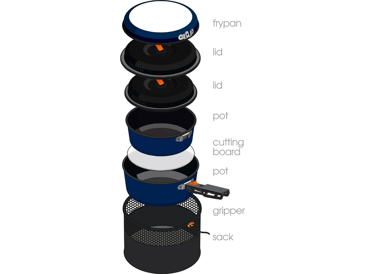 Das Bugaboo Base Camper Small ist ein komfortables Topfset für 2 Personen, mit dem das Kochen beim Camping und unterwegs wahrlich Freude bereitet. Das Kochset besteht aus 2 TEFLON-beschichteten Aluminium-Töpfen (1,5 & 2 l), die jeweils einen hitzebeständigen Kunststoffdeckel mit praktischer Abgießöffnung haben. Eine ebenfalls beschichtete Pfanne und ein Schneidbrett ergänzen das Topfset zur Vollausstattung für die komfortable 2-Personen-Küche. Die GSI Griffzange lässt sich an den Töpfen arretieren und verhindert somit ein versehentliches Abrutschen. Geliefert wird das Bugaboo Base Camper Small perfekt ineinandergstapelt in einem leichten Packbeutel, der den Deckel an Ort und Stelle hält.