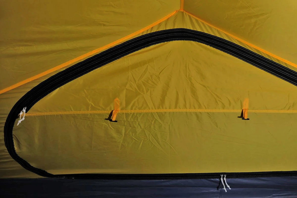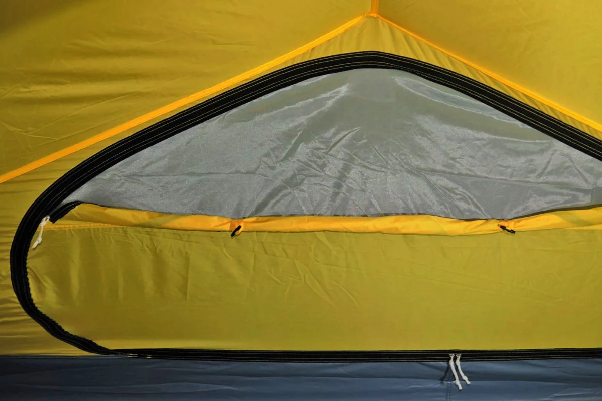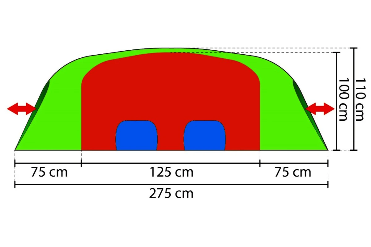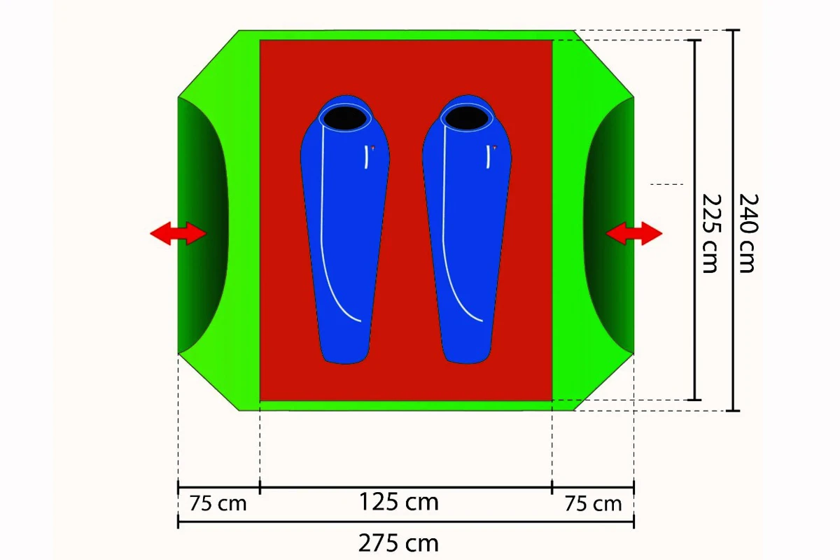 - zwei gegenüberliegende Eingänge und zwei Vorräume an den Längsseiten des Innenzeltes