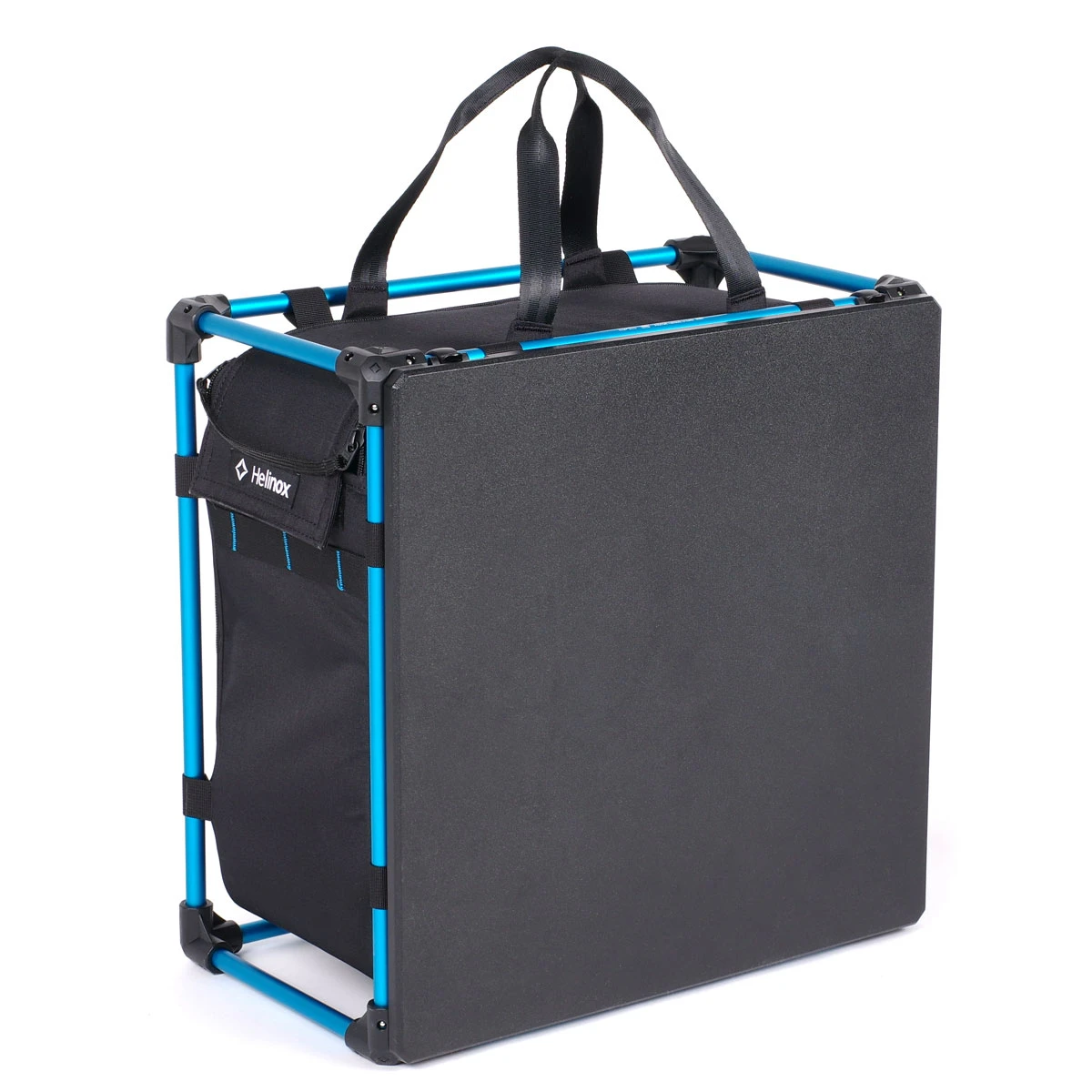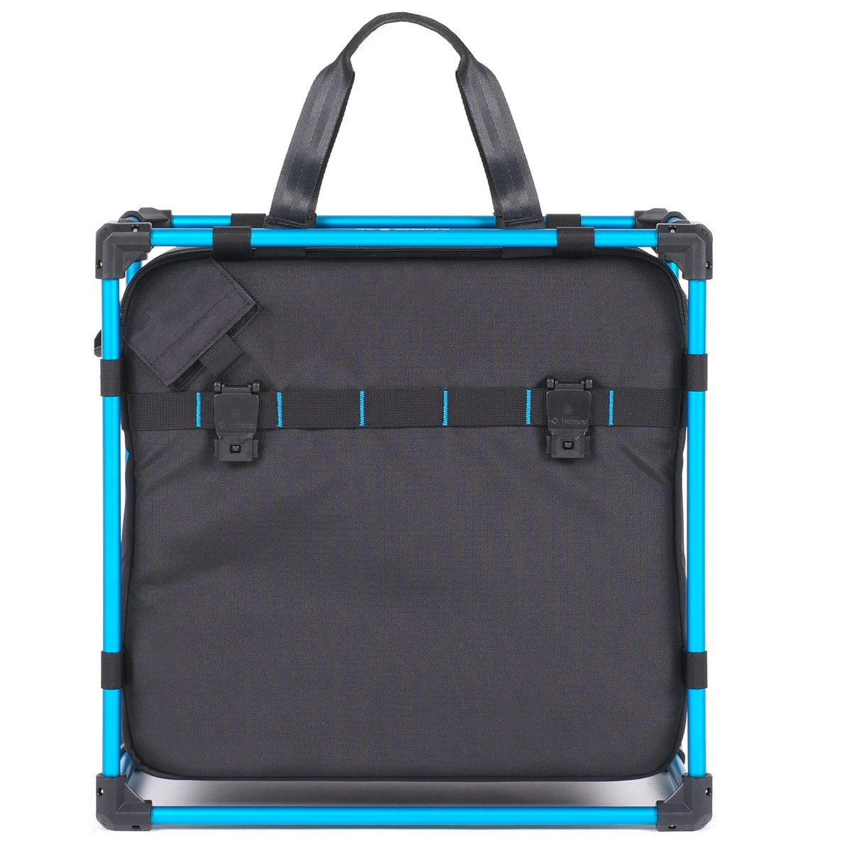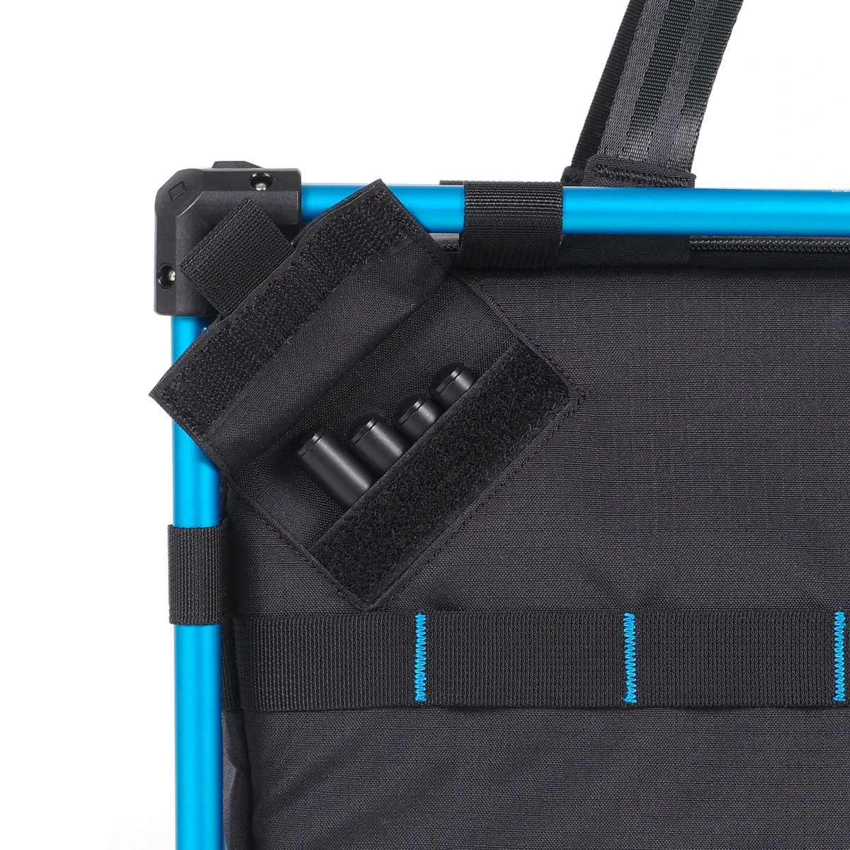 (Dr)Außendienstmitarbeiter. Das Helinox Field Office ist ein mobiler, tragbarer Arbeitsplatz. Wertvolles elektronisches Equipment bis in Laptop-Größe ist in der stabilen Tasche, die in einen Stoßrahmen aus DAC-Aluminium eingehängt ist, doppelt geschützt. Die integrierte robuste Kunststoff-Tischplatte des Field Office hat eine Tragfähigkeit von bis zu 30 kg und lässt sich am Rahmen einfach ausklappen. Sie kann aber auch als separater, von der Tasche getrennter Tisch aufgestellt werden. Helinox hat die Tasche des Field Office so gestaltet, dass ein bequemer Zugriff sowohl von oben als auch von der Seite her möglich ist. Bei Bedarf kann der Stoßrahmen mit Hilfe des mitgelieferten kleinen Knebelknopf-Werkzeuges geöffnet und die Tasche auch ohne Rahmen verwendet werden. Getragen wird das Field Office am langen Handtragegriff oder einfach am Aluminiumrahmen, was vor allem zu zweit sehr praktisch ist. Als optionales Zubehör ist ein Schultertragegurt erhältlich. Eine gepolsterte Innentasche mit flexibel anordenbarer Inneneinteilung kann eine sinnvolle Ergänzung z.B. für Foto-Equipment sein.