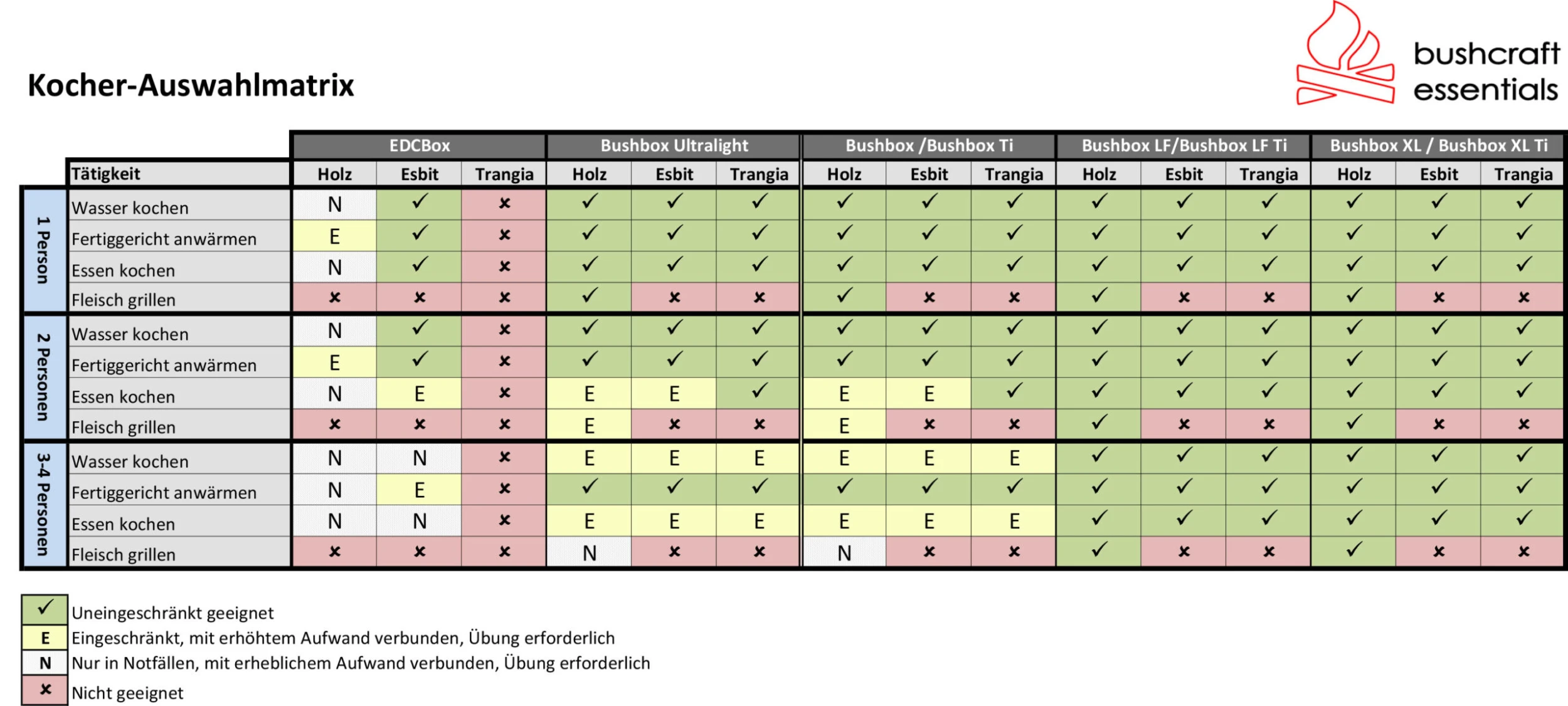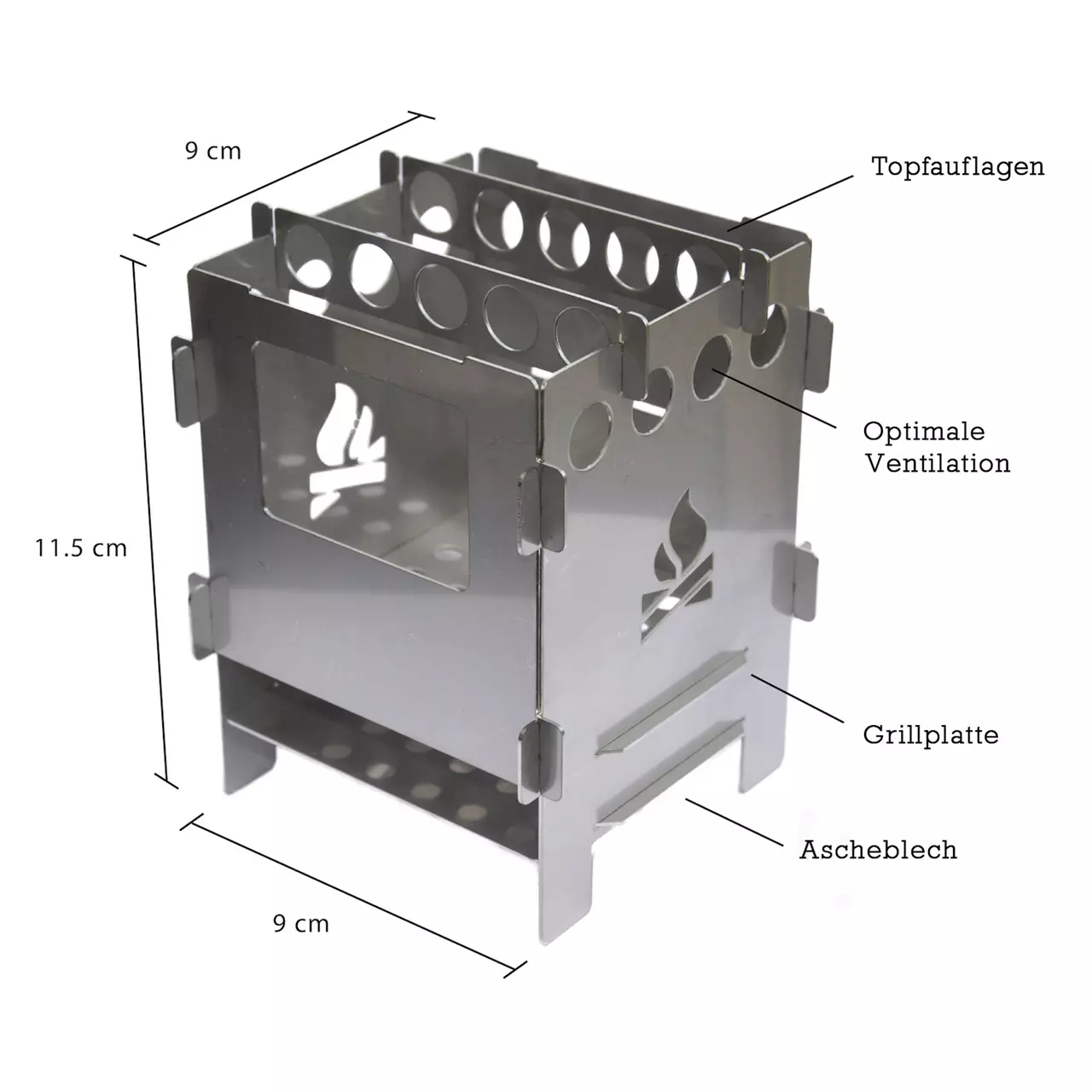 - mögliche Brennstoffe: Holz, Brennstofftabletten (z. B. Esbit), Brennpaste im Tiegel, Spiritusbrenner (z. B. Trangia)