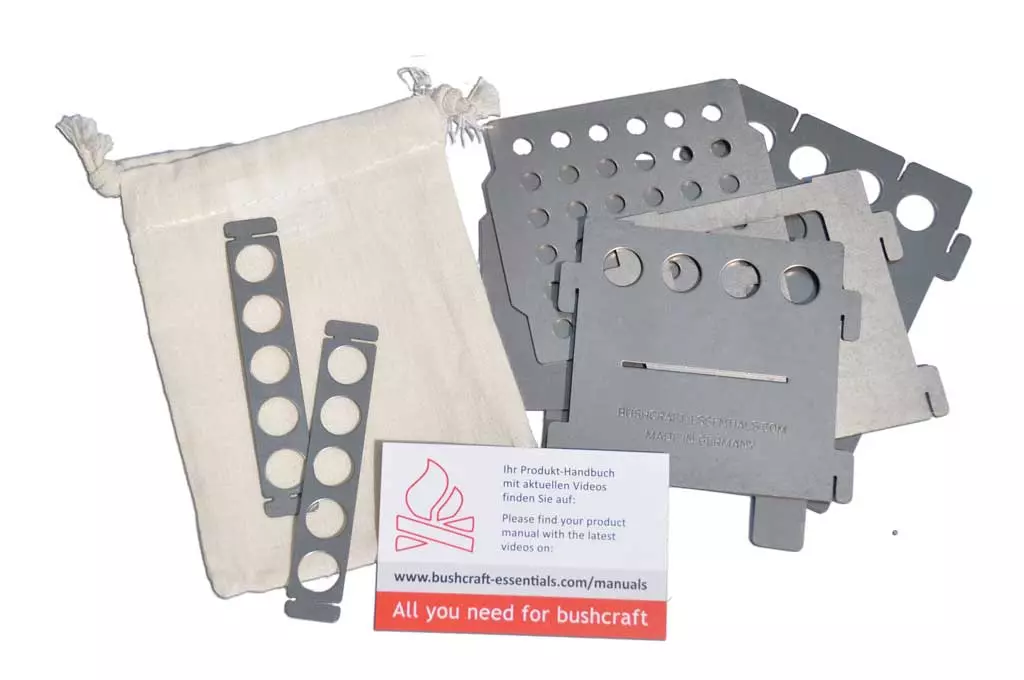 Bushcraft Essentials stellt den Kocher komplett in Deutschland her. Die Bushbox wird in einer Baumwolltasche als Umverpackung geliefert. Für eine möglichst umweltschonenende Produktion wird auf eine Oberflächenveredelung des Edelstahls verzichtet.