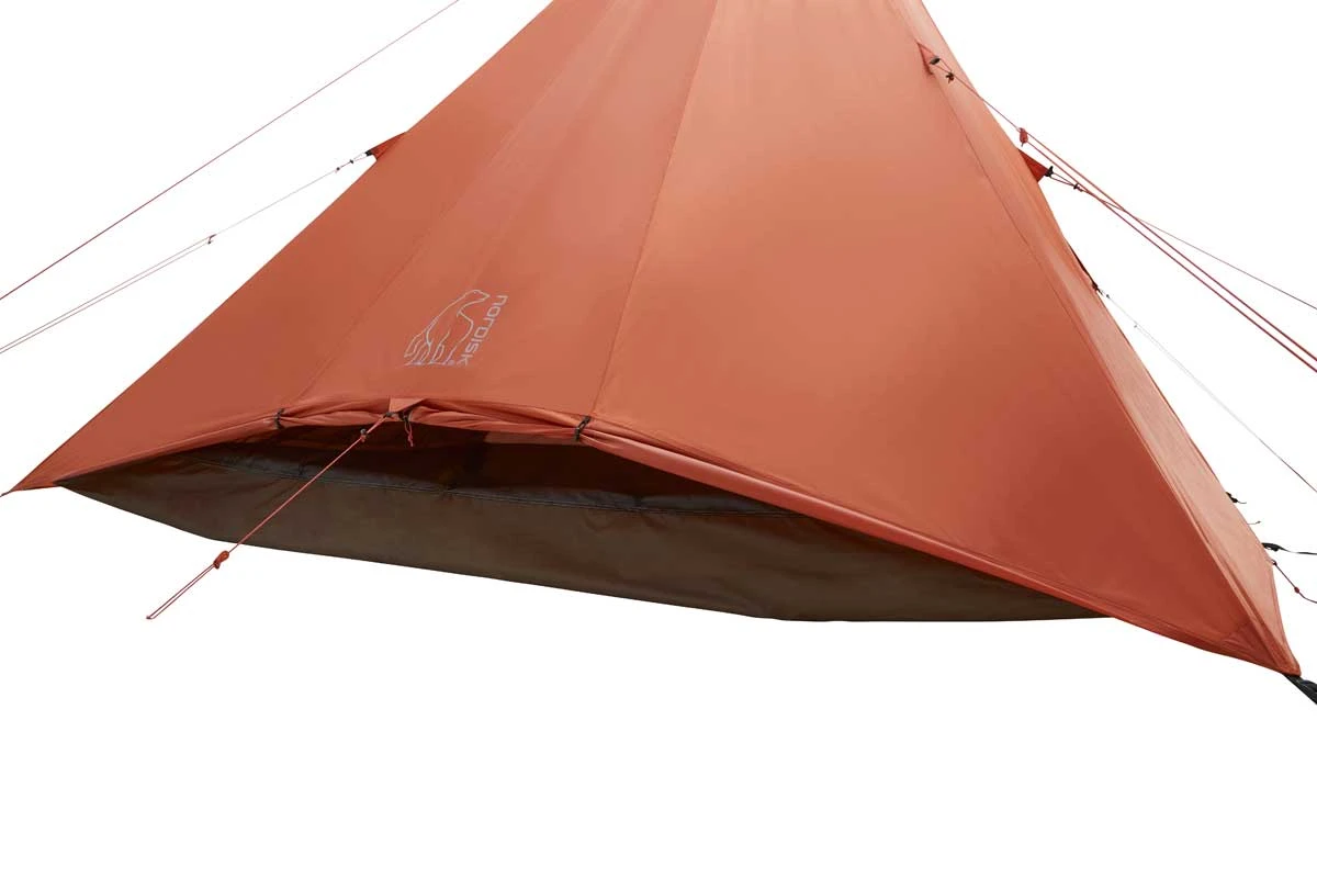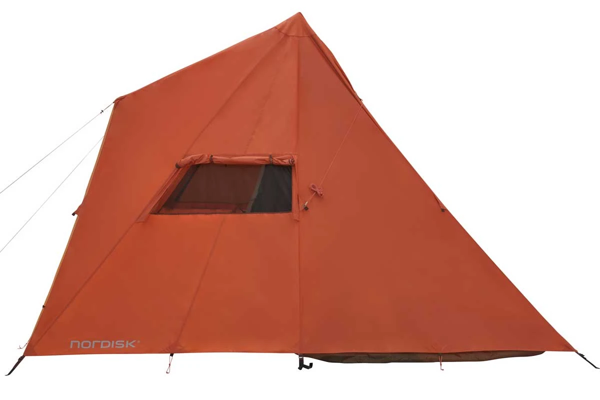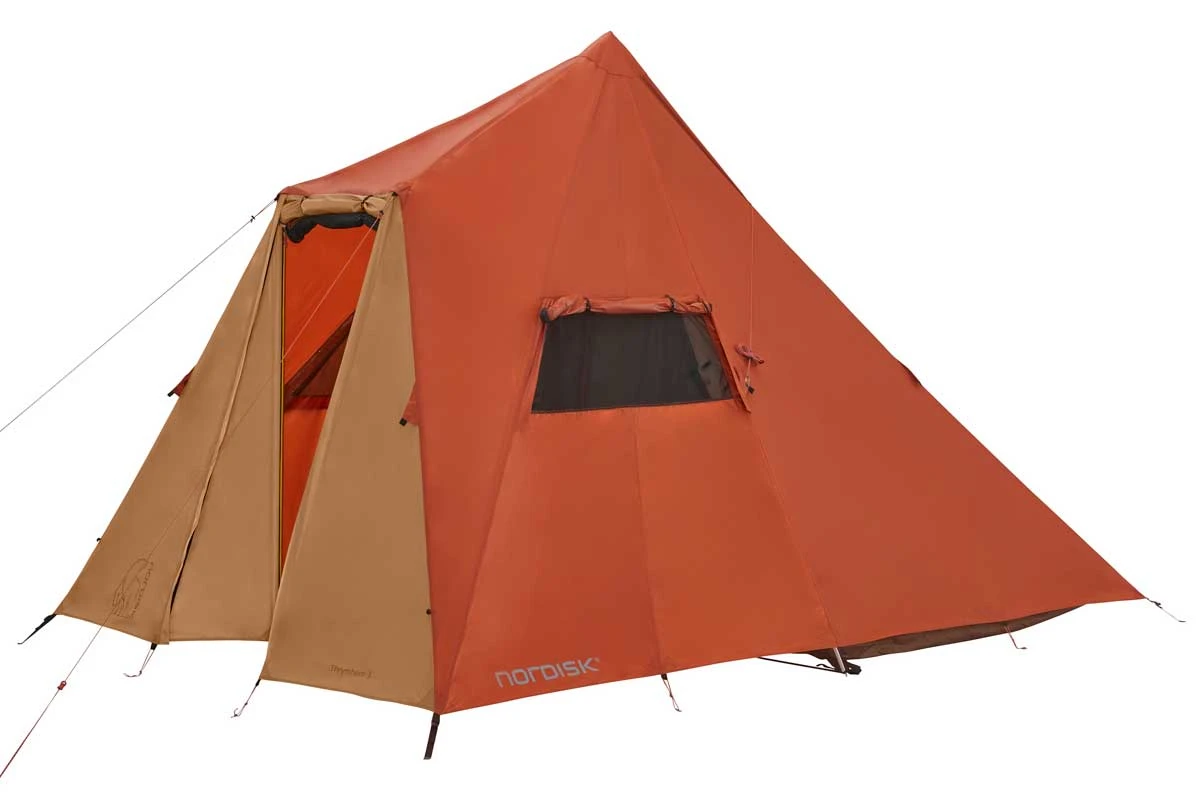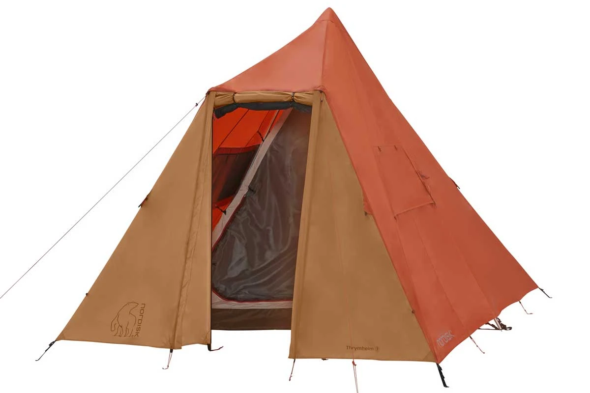 1A: Das Nordisk Thrymheim 3 ist ein Tipi ohne Mittelstange! Diese wurde durch einen A-Rahmen ersetzt, der an den Außenwänden des Familienzeltes verläuft und die Raumnutzung nicht stört. Der Innenraum des stehhohen 2-3-Personen-Zeltes wird zusätzlich durch eine Eingangslösung mit zwei Aufstellstangen vergrößert. Dieser Eingang bietet optimalen Wetterschutz und läßt sich sehr flexibel mit unterschiedlichsten Öffnungsvarianten an wechselnde Wetterbedingungen anpassen. Das Innenzelt ist asymmetrisch geschnitten und bietet zwei Menschen die Möglichkeit, neben den Isomatten noch umfangreich Gepäck zu lagern. Zugleich führt der besondere Innenzelt-Schnitt dazu, dass auf einer Seite des Vorraumes des Nordisk Thrymheim 3 sogar Fahrräder geparkt werden können. Das außergewöhnliche Tipi ist schnell aufgebaut und kann über verschließbare Moskitonetzfenster im Vorraum, am Zeltheck und in der Zeltspitze sehr effizient belüftet, sowie über zahlreiche Abspannmöglichkeiten stabil gegen Wind gesichert werden.