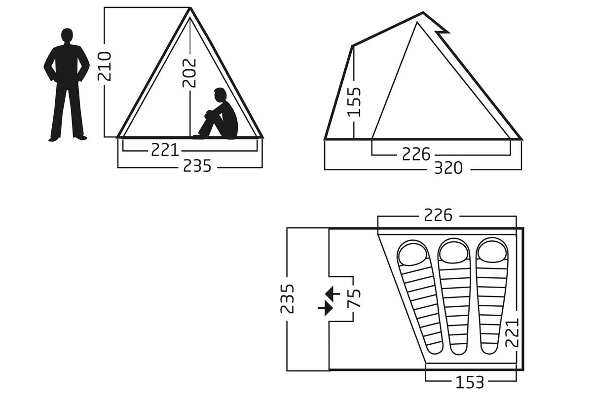 - Innenzelt mit Stehhöhe ist für zwei Personen sehr schön geräumig, für drei Menschen ausreichend