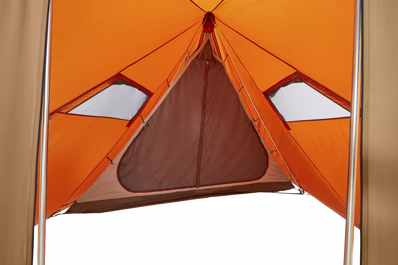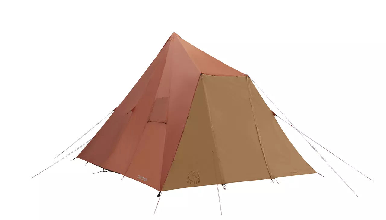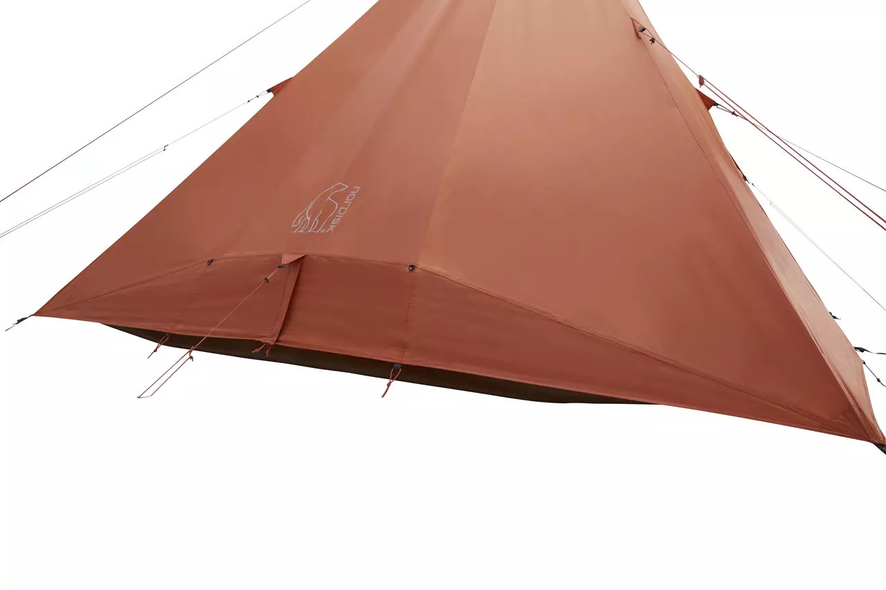 Freiraum. Das Nordisk Thrymheim 5 PU ist ein Tipi, das vollkommen frei ist von einer Mittelstange! Diese wurde durch einen A-Rahmen ersetzt, der an den Außenwänden des Gruppenzeltes verläuft und die Raumnutzung nicht stört. Der Innenraum des stehhohen Familienzeltes für bis zu 5 Personen wird zusätzlich durch eine Eingangslösung mit zwei Aufstellstangen vergrößert. Dieser Eingang bietet optimalen Wetterschutz und läßt sich sehr flexibel mit unterschiedlichsten Öffnungsvarianten an wechselnde Wetterbedingungen anpassen. Das Innenzelt ist asymmetrisch geschnitten und bietet vier erwachsenen Menschen die Möglichkeit, neben den Isomatten noch umfangreich Gepäck zu lagern. Der vor Insekten geschützte Raum ist aber auch groß genug für zwei Erwachsene und drei Kinder. Zugleich führt der besondere Innenzelt-Schnitt dazu, dass auf einer Seite des Vorraumes des Nordisk Thrymheim 5 PU auch entspannt Fahrräder geparkt werden können. Das außergewöhnliche Tipi ist schnell aufgebaut und kann über verschließbare Moskitonetzfenster im Vorraum, am Zeltheck und in der Zeltspitze sehr effizient belüftet, sowie über zahlreiche Abspannmöglichkeiten stabil gegen Wind gesichert werden.