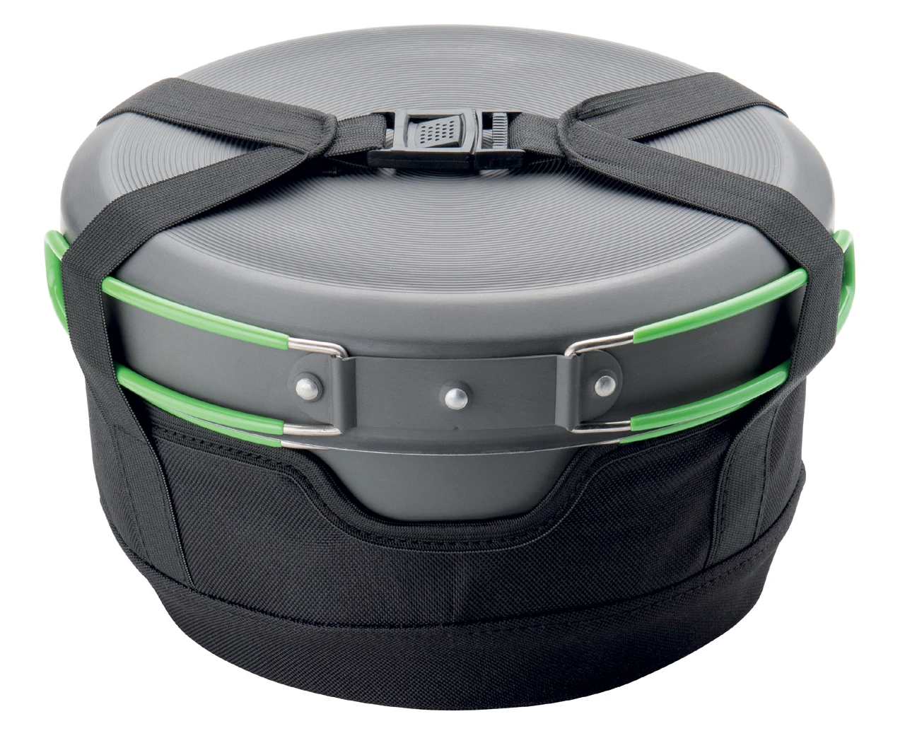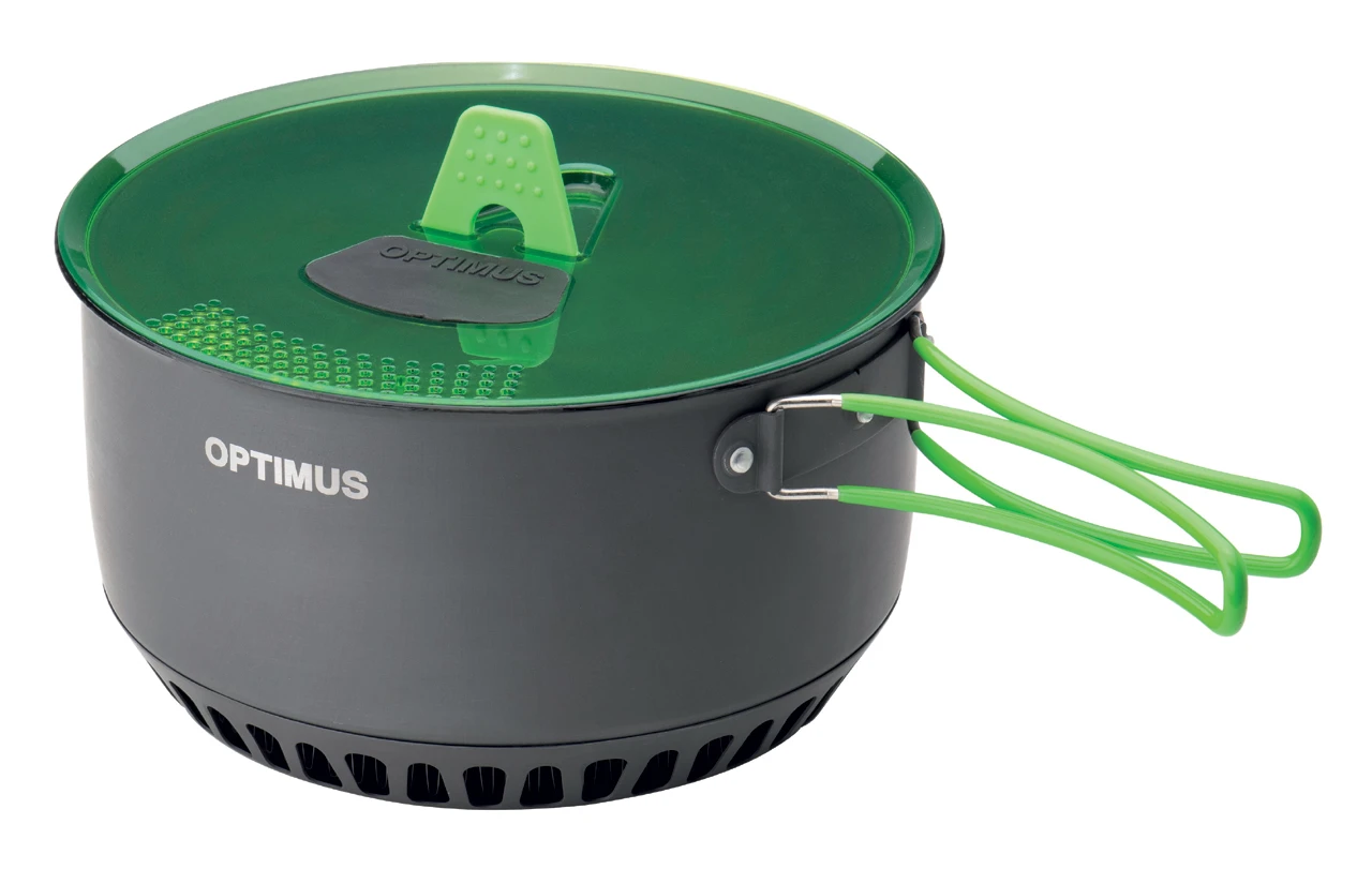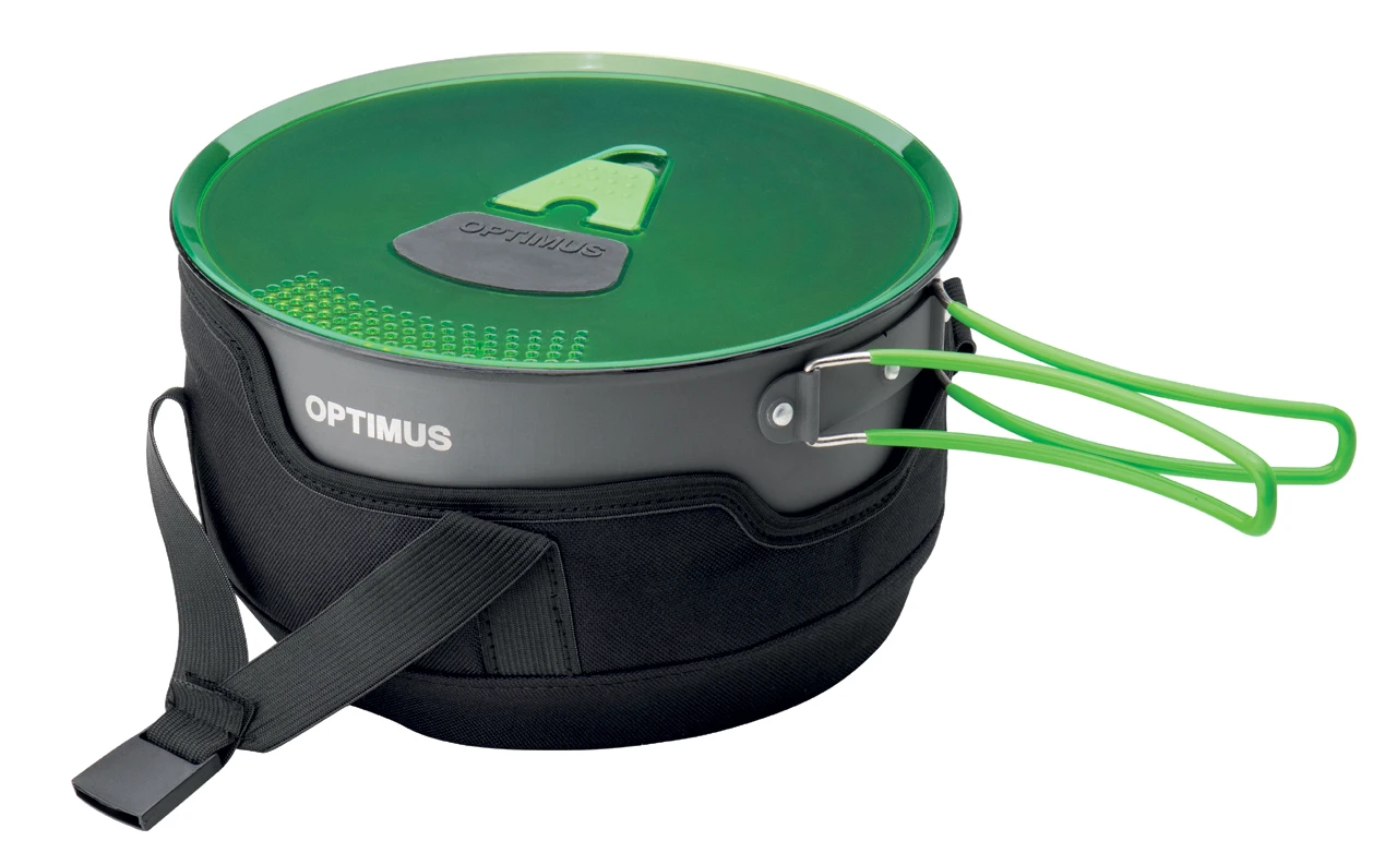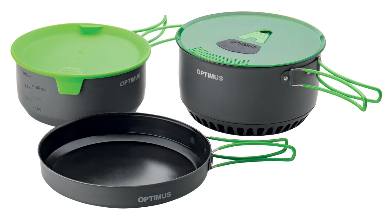Das Topfset Terra Camp 4 von Optimus ist das ideale Set für Familien. Die zwei Töpfe mit 2,3 und 3,2 Litern Fassungsvermögen schaffen große Nudelportionen für hungrige Familienreisende. Beide Töpfe sind mit einer langlebigen PTFE-Antihaftbeschichtung und die Pfanne mit einer robusten Keramik beschichtet. Damit hält sie tapfer die energischsten Bratenattacken oder auch das Umrühren mit einem Metallöffeln aus. Der große Topf hat für ein optimales Kochverhalten eine Wärmetauscher im Boden, um die Hitze gleichmäßig und effizient zu verteilen. Damit reduziert sich die Kochzeit um gut 30 %, was zusätzlich auch Brennstoff spart. Die silikonisierten Griffe und Deckelvarianten schützen die Hände des Kochs oder der Köchin und Optimus hat natürlich auch ein paar zusätzliche Rafinessen parat. So gibt es ein Sieb zum Abgießen, welches in den Deckel integriert ist, die Töpfe haben eine eingeprägte Meßskala, der Transportbeutel dient gleichzeitig als Isolationsbeutel zum warm halten der Gerichte und die Deckel können während der Essensausgabe seitlich am Topf fixiert werden. Damit bleiben sie sauber und halten beim erneuten Verschließen die restlichen Speisen warm.
