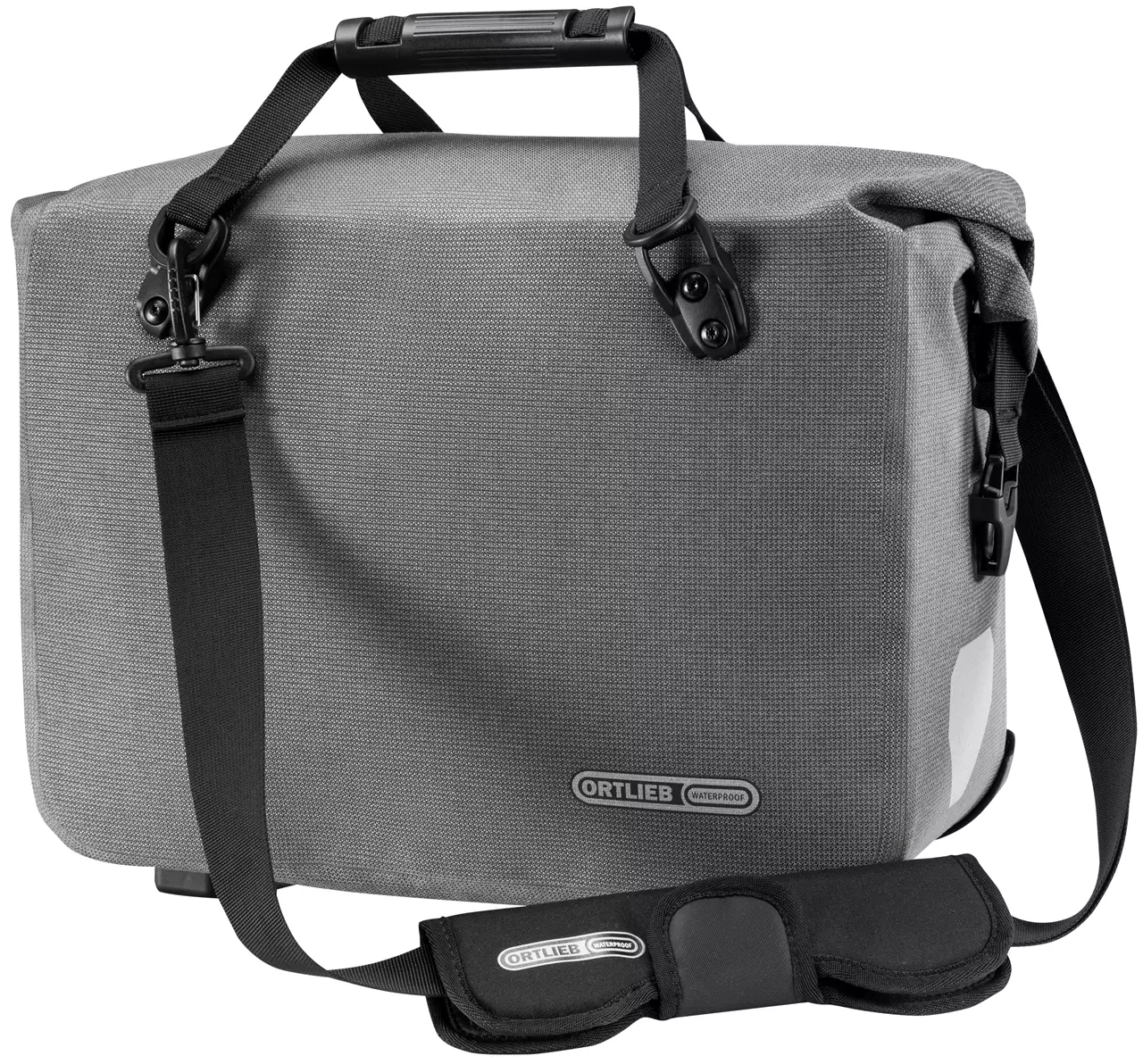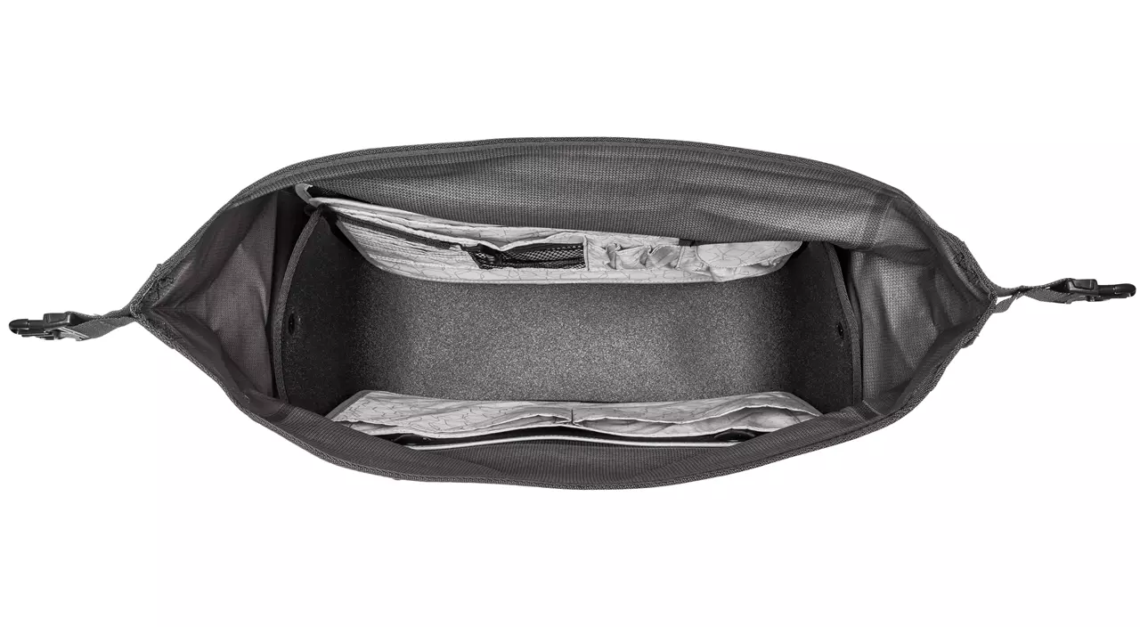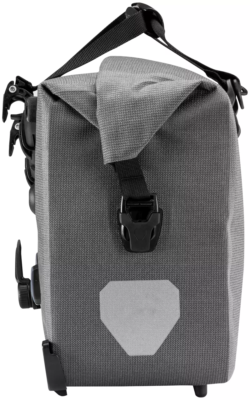 Wasserdichte und sehr robuste Fahrrad-Aktentasche mit Rollverschluss und Kantenschutz: Das Office-Bag Urban QL2.1 ist mit dem werkzeuglos verstellbaren Befestigungssystem auf einer diagonal angebrachten, drehbaren Halteschiene ausgestattet, sodass die Tasche links oder rechts mit optimaler Pedalfreiheit am Gepäckträger angebracht werden kann. Im Inneren verbergen sich zahlreiche Organizer-Taschen sowie ein Laptopfach. Das rechteckige Design ist dafür ausgelegt, zwei A4-Ordnern bequem Platz zu bieten. Hast du dein Ziel erreicht, kannst du das Office-Bag Urban QL2.1 an seinen kurzen Griffen tragen oder mit dem beiligenden Schultergurt als Umhängetasche nutzen. Das Urban-Material hat eine textile Optik, ist aber, wie alle Produkte von Ortlieb, wasserdicht.