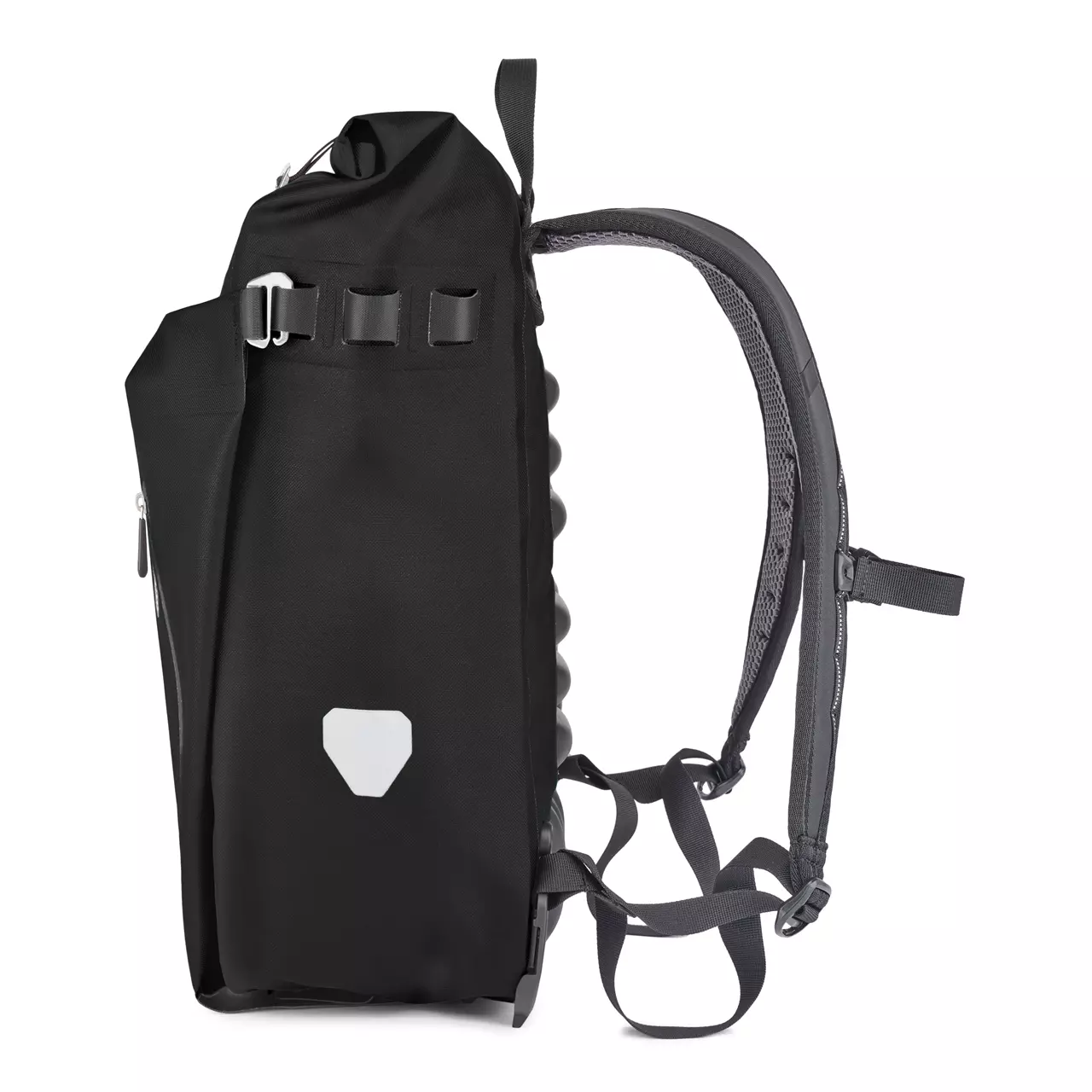 Mit dem Vario PS QL2.1 20L baut Ortlieb einen Hybrid aus Rucksack und Fahrradtasche. Die Tasche mit einem Volumen von 20 Litern hat auf der einen Seite die bewährte QL2.1-Aufhängemechanik, mit der sie stabil am Gepäckträger befestigt wird. Hat man das Ziel erreicht, wird die flexible Front einfach über die Hakenleiste geschlagen und auf der freigewordenen Seite kommen Schultergurte zum Vorschein. Damit lassen sich dann die Wege in der Stadt komfortabel bewältigen. Der “Umbau” geschieht in wenigen Augenblicken und geht intuitiv von der Hand. Optimal für die urbane Nutzung ist der Vario PS mit einem Laptopfach ausgestattet. Eine Reißverschlusstasche, die in die Wendefront eingelassen ist, komplettiert die Ausstattung. Der Rollverschluss ermöglicht eine variable Anpassung des Rucksackvolumens an den Inhalt. Wie für Ortlieb üblich, ist der Vario PS natürlich wasserdicht.
