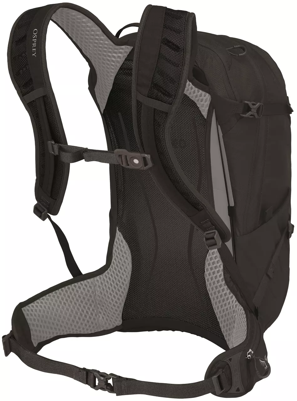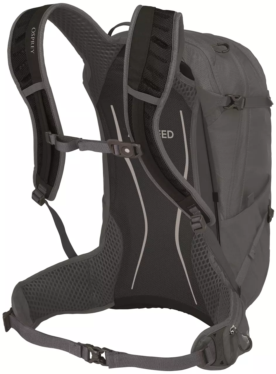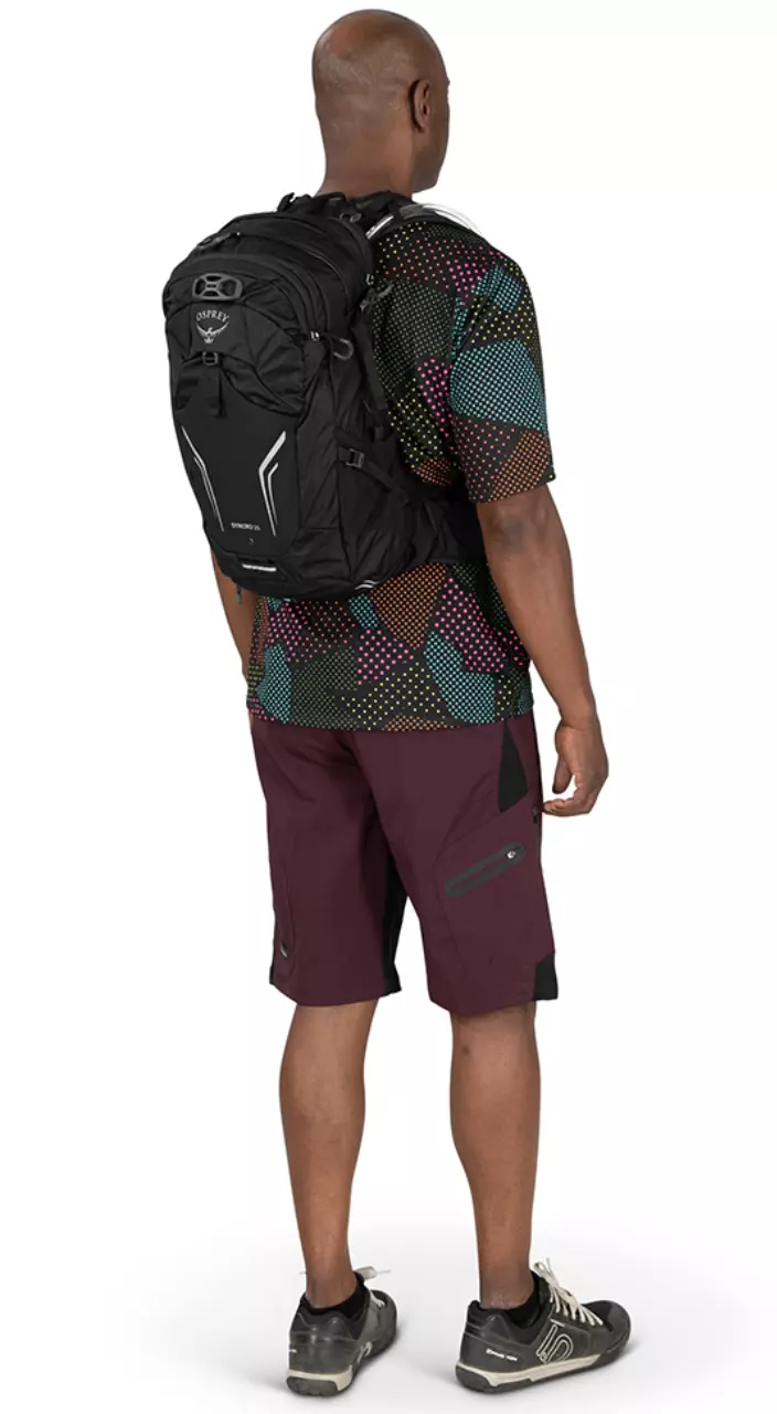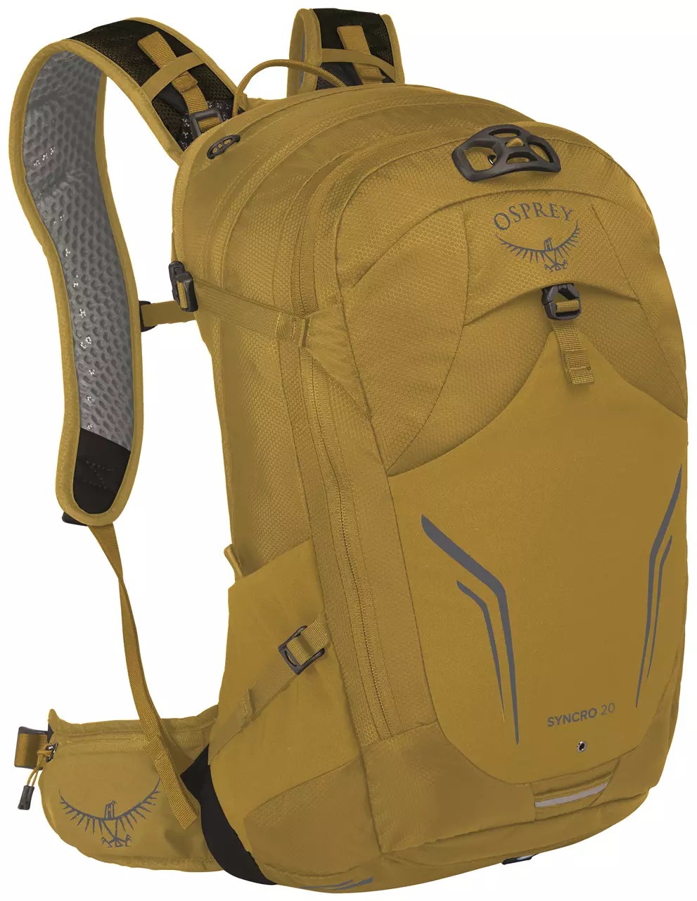 Der Synco 20 ist ein leichter Fahrradrucksack mit einem tollen Tragekomfort. Osprey stattet ihn mit dem hinterlüfteten AirSpeed™-Rückensystem und einem verstärkten Aluminium-Leichtrahmen (LightWire™) aus. Diese Kombination sorgt für ein deutlich schwitzreduziertes Tragen und für eine sehr gute Lastenübertragung. Hinzu kommen ein Nackenbereich aus Mesh und weiche, luftige BioStretch™-Schultergurte, die ebenfalls für die maximale Luftzirkulation zuständig sind. Das Volumen von 20 Litern verteilt sich auf ein Hauptfach, ein reichlich unterteiltes Zubehör- und Werkzeugfach mit weiter J-Öffnung, eine weich ausgekleidete Reißverschlusstasche für den kratzfreien Transport von Sonnenbrillen und elektronischen Geräten, ein elastisches Frontfach, zwei elastische Flaschen- sowie zwei Hüftgurttaschen. Das Potential zum geordneten Packen bietet der Syncro 20 also definitiv und auch auf die Ergänzung mit einem Trinksystem ist der Osprey-Rucksack vorbereitet. Das schmale Profil des Rucksacks und die LidLock™-Fahrradhelmbefestigung sind ideal für Fahrer, die eine effiziente und bewegliche Lösung zum Transport ihrer Ausrüstung suchen. Und sollte ein plötzlicher Regenschauer eintreten, ist die integrierte Regenhülle im Handumdrehen übergestülpt und die Fahrt kann weitergehen! Für leichte Tagestouren und als komfortabler Begleiter für Städtereisen ist der Syncro 20 übrigens auch geeignet, da seine Geometrie zwar schon für das Radfahren ausgelegt ist, aber andere Aktivitäten nicht ausschließt.