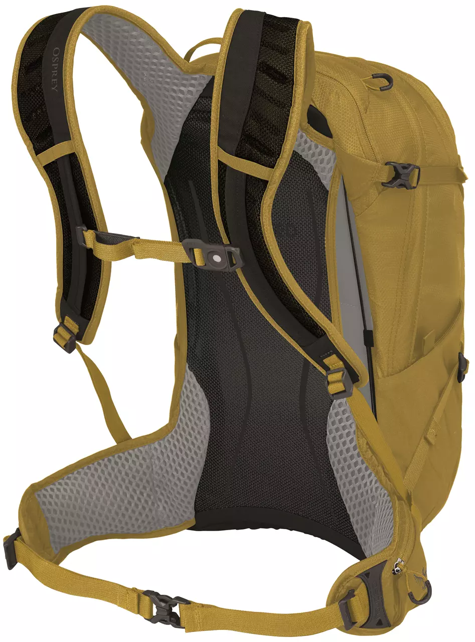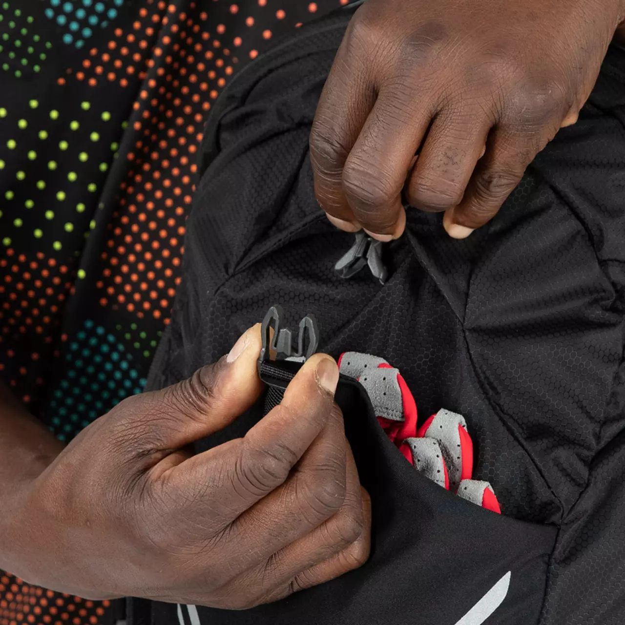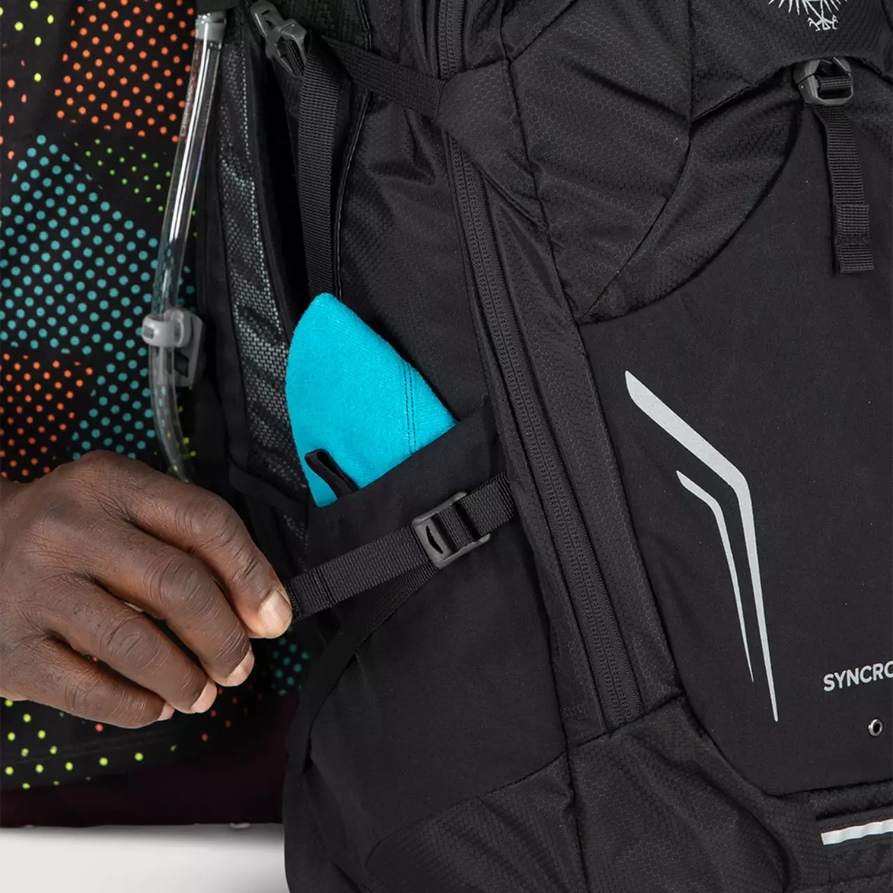 Der Synco 20 ist ein leichter Fahrradrucksack mit einem tollen Tragekomfort. Osprey stattet ihn mit dem hinterlüfteten AirSpeed™-Rückensystem und einem verstärkten Aluminium-Leichtrahmen (LightWire™) aus. Diese Kombination sorgt für ein deutlich schwitzreduziertes Tragen und für eine sehr gute Lastenübertragung. Hinzu kommen ein Nackenbereich aus Mesh und weiche, luftige BioStretch™-Schultergurte, die ebenfalls für die maximale Luftzirkulation zuständig sind. Das Volumen von 20 Litern verteilt sich auf ein Hauptfach, ein reichlich unterteiltes Zubehör- und Werkzeugfach mit weiter J-Öffnung, eine weich ausgekleidete Reißverschlusstasche für den kratzfreien Transport von Sonnenbrillen und elektronischen Geräten, ein elastisches Frontfach, zwei elastische Flaschen- sowie zwei Hüftgurttaschen. Das Potential zum geordneten Packen bietet der Syncro 20 also definitiv und auch auf die Ergänzung mit einem Trinksystem ist der Osprey-Rucksack vorbereitet. Das schmale Profil des Rucksacks und die LidLock™-Fahrradhelmbefestigung sind ideal für Fahrer, die eine effiziente und bewegliche Lösung zum Transport ihrer Ausrüstung suchen. Und sollte ein plötzlicher Regenschauer eintreten, ist die integrierte Regenhülle im Handumdrehen übergestülpt und die Fahrt kann weitergehen! Für leichte Tagestouren und als komfortabler Begleiter für Städtereisen ist der Syncro 20 übrigens auch geeignet, da seine Geometrie zwar schon für das Radfahren ausgelegt ist, aber andere Aktivitäten nicht ausschließt.
