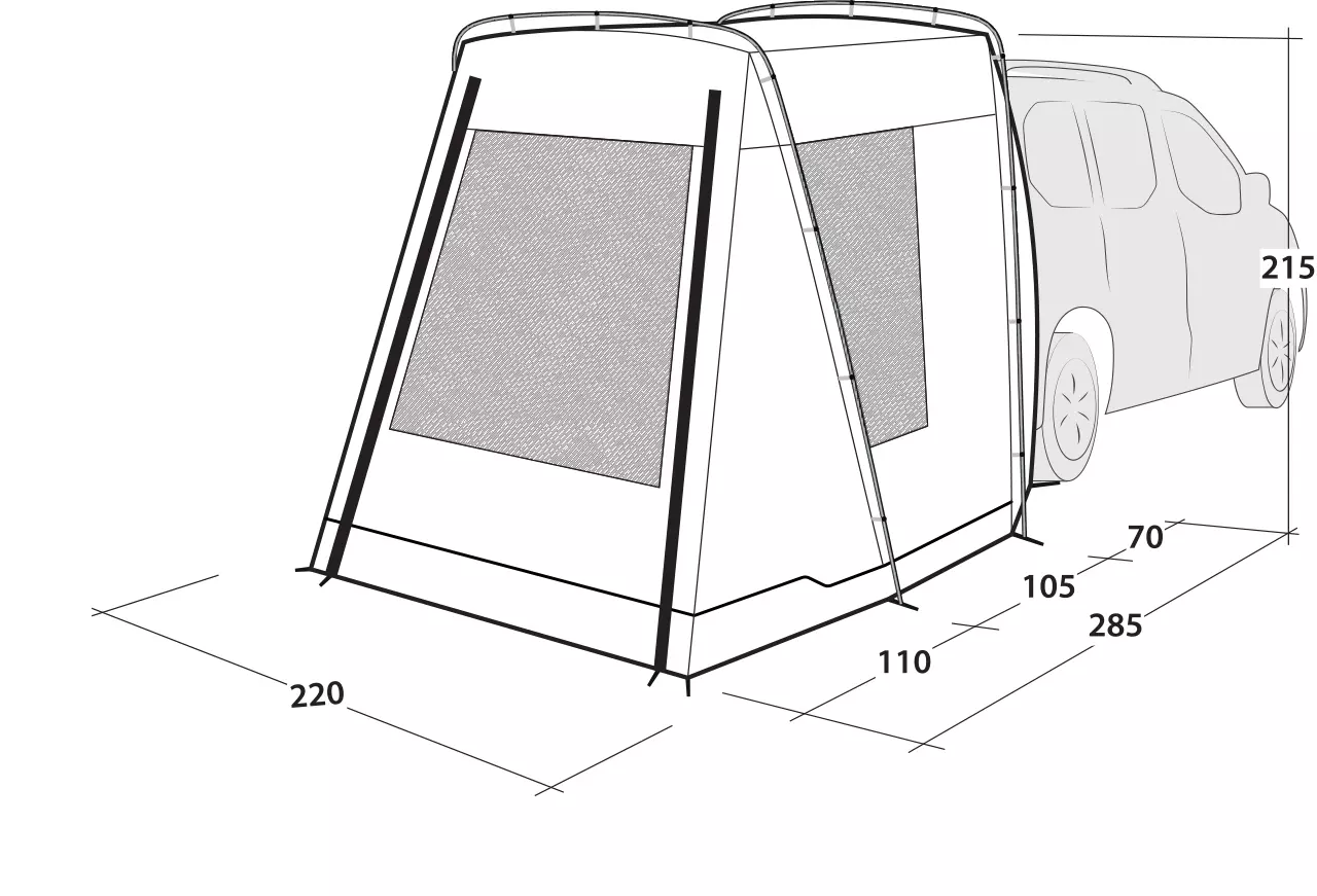 Das Outwell Dunecrest ist ein Vorzelt für die Hecktüren von Minivans und SUVs mit Dachhöhen von 170 – 185 cm (VW Caddy, Peugeot Rifter u.ä.). Das 2-Bogen-Tunnelzelt-Design und robuste Abspannbänder gewährleisten volle Drive-Away-Funktion. Die Hecktür des Autos lässt sich dabei im Vorzelt öffnen und schließen. Die einknöpfbare, robuste Bodenwanne schützt vor Schmutz, Feuchtigkeit, Zugluft und Insekten. Die seitlichen Türen des Fahrzeugs bleiben auch mit angedocktem Vorzelt voll zugänglich. Das Outwell Dunecrest verfügt über drei große Mesh-Fenster, die alle mit wasserdichten Vorhängen stufenlos verschlossen werden können. Der Fronteingang in das 215 cm hohe Vorzelt punktet mit flexiblen Öffnungsmöglichkeiten sowie der Option, die Tür zum Vordach aufstellen zu können (Tarpstangen sind nicht im Lieferumfang enthalten).