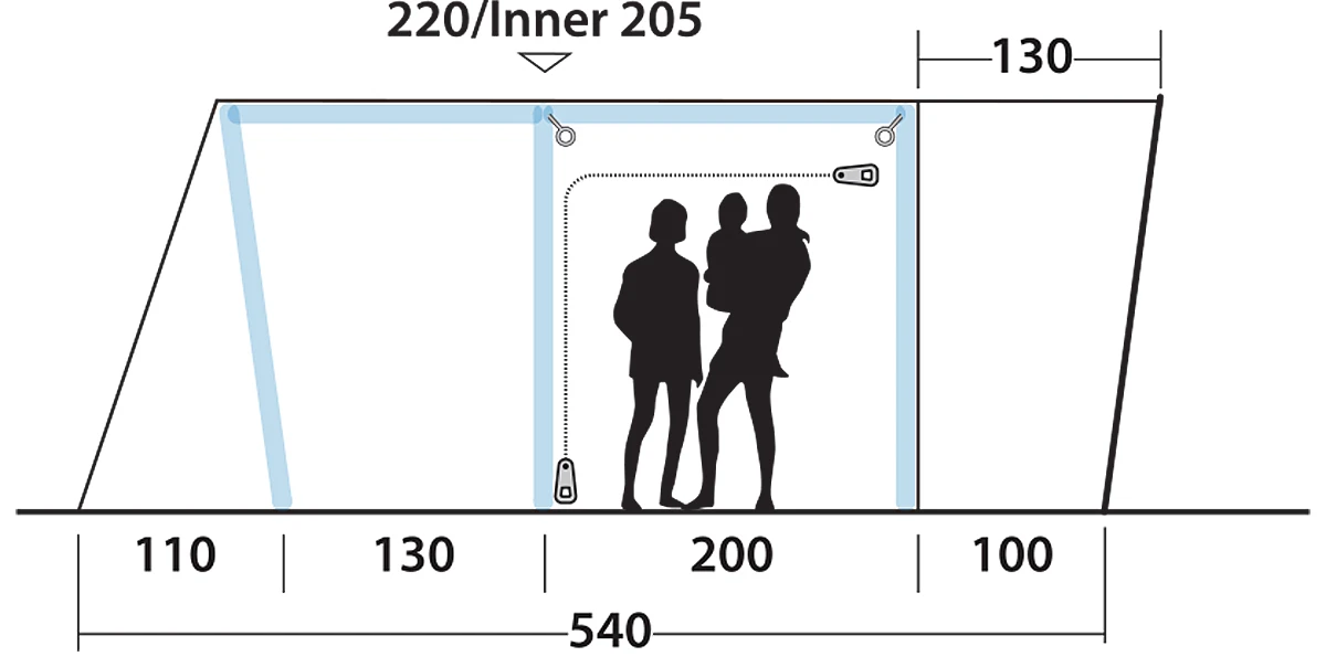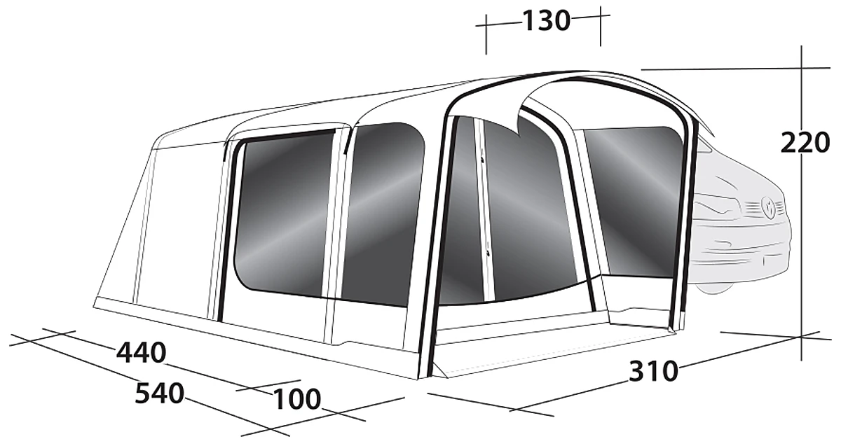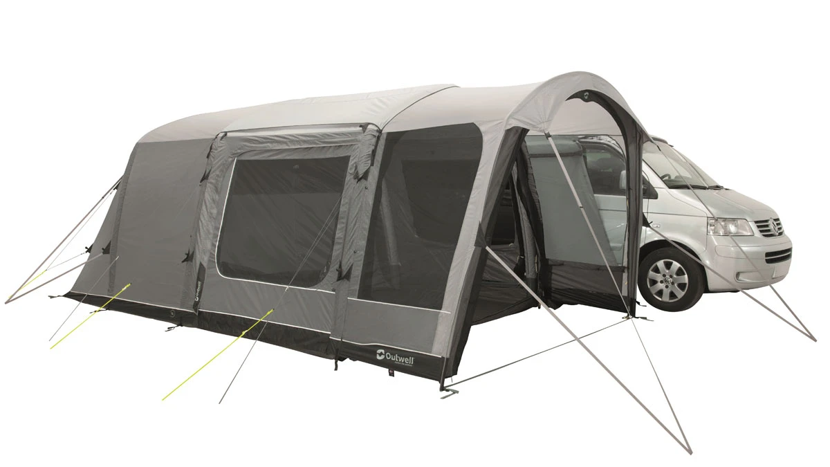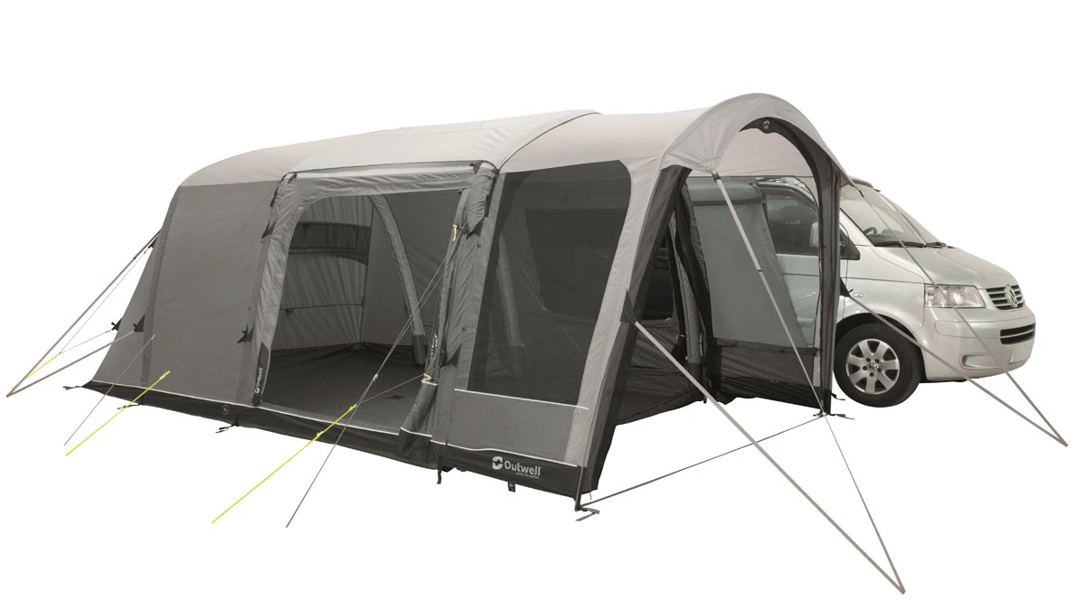 Alleskönner. Das Outwell Jonesville 440SA Flex ist ein maximal flexibles Busvorzelt mit Luftschläuchen als tragendem Element. Es steht parallel zum Fahrzeug – allerdings ist die Seite, auf der es steht, nicht durch eine angenähte Schleuse vorgegeben. Der mit zwei seitlichen Türen versehene Übergangsbereich zum Auto kann beim Outwell Jonesville 440SA Flex an beiden Seitentüren des Vorzeltes angebracht werden. Natürlich lässt sich die beidseitig platzierbare Schleuse auch ganz weglassen – dann entsteht bei Verwendung des Innenzeltes ein vollwertiges Familienzelt mit vier Schlafplätzen. Das zweite flexible Element des Outwell Jonesville 440SA Flex ist die Zeltfront, die sich wahlweise ganz vorn oder um einen Meter ins Innere des Zeltes versetzt einzippen lässt. So erhalten die Bewohner des Busvorzeltes entweder einen größeren Wohnraum oder einen überdachten Außenbereich. Für den Fall, dass in Letzterem nasse Ausrüstung gelagert werden soll, lässt sich in diesem Bereich der Boden wegklappen.