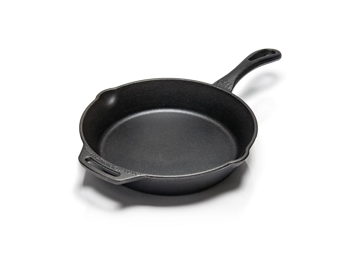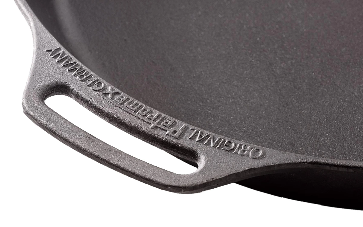 Einfach und rustikal kommt die Feuerpfanne von Petromax daher. Gefertigt ist sie aus Gusseisen, einem Material, das auf der einen Seite gern von Sterneköchen verwendet wird, auf der anderen Seite aber ebenso beim Kochen unter freiem Himmel absolut überzeugen kann. Denn eines möchte diese Pfanne nicht: mit Samthandschuhen angefasst werden. Ob daheim auf dem Herd, im Ofen, auf dem Zweiflammenkocher im Bus oder direkt auf den glühenden Kohlen des Lagerfeuers: Die Petromax-Pfanne ist ein unverwüstliches Universaltalent. Ein weiterer Vorteil ist die hervorragende Wärmeverteilung des gusseisernen Materials, die den Pfanneninhalt gleichmäßig erwärmt. Bei regelmäßigem Gebrauch und sachgemäßer Pflege bildet sich mit der Zeit eine Patina aus eingebranntem Fett, sozusagen eine natürliche Antihaftbeschichtung. So löst sich das Bratgut ganz von allein. Petromax liefert die Feuerpfanne aber mit einer vorbehandelten Oberfläche aus (seasoned finish), sodass das Kochabenteuer gleich beginnen kann! Die Petromax-Pfanne gibt es bei uns in zwei Größen: Mmt einem Durchmesser von 25 oder 35 cm und dem entsprechenden Fassungsvermögen von 1,6 Liter oder 3,5 Liter. Am langen Stiel lässt sich die Feuerpfanne auch aufhängen und somit zur stilvollen Küchendekoration umfunktionieren. Außerdem lässt sich die Pfanne, die mit 2,5 bzw. 4,6 kg wahrlich kein Leichtgewicht ist, auch mit zwei Händen greifen und sicher auf den Tisch bringen.