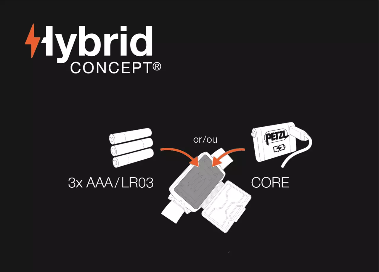 - Hybrid-Lampe: Betrieb mit 3AAA Batterien (enthalten) oder Petzl CORE-Akku möglich (nicht im Lieferumfang enthalten)