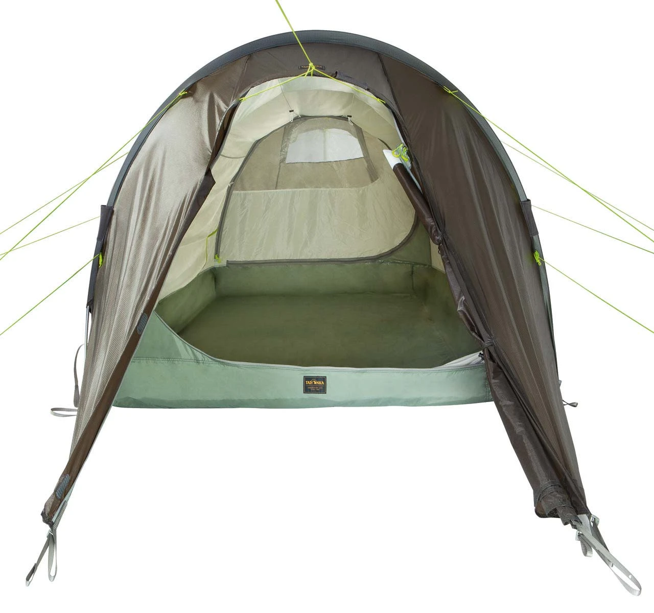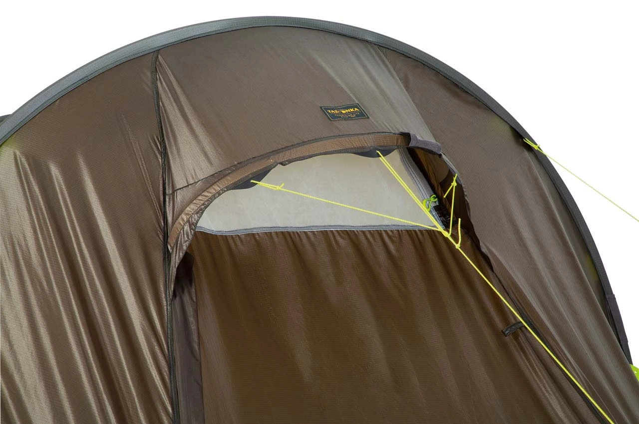 Der Wohnkomfort im Tatonka Rokua 2 lässt sich aber nur deshalb so entspannt geniessen, weil man sich um das Wetter draußen keine Gedanken machen muss: Das 8,6 mm starke Aluminium-Gestänge trägt über robuste Gestängekanäle das dauerhaft wasserdichte und sehr reißfeste Außenzelt aus beidseitig mit Silikon beschichtetem Ripstop-Nylon. Die Abspannleinen fassen unmittelbar am Gestängekanal und stabilisieren so das Gestänge optimal bei starkem Wind. Das Außenzelt reicht bis auf dem Boden und gibt dem Wind damit keine Chance, das Außenzelt “anzuheben” – auch Regen gelangt so nicht zwischen Außen- und Innenzelt. Die haltbare, mit Polyurethan-beschichtete Bodenwanne ist komplett nahtfrei gearbeitet und bezüglich ihrer Wasserdichtigkeit über jeden Zweifel erhaben. Das Tatonka Rokua 2 weist damit alle Eigenschaften eines vollwertigen 4-Jahreszeiten-Zeltes auf – nur die Nylon-Abdeckungen für die Mesh-Fenster im Innenzelt und an den Lüftern fehlen. Das lässt sich entweder durch dickere Schlafsäcke kompensieren oder Du sagst Dir: Macht nix, mit dem Tatonka Rokua 2 bekomme ich ein absolut gelungenes Gesamtpaket, das mich lange, auf langen Touren und auch bei widrigsten Witterungsbedingungen sicher begleiten wird – und richtig kalte Wintertouren mache ich sowieso nicht. Dann herzlichen Glückwunsch: Das Tatonka Rokua 2 ist DEIN Zelt!