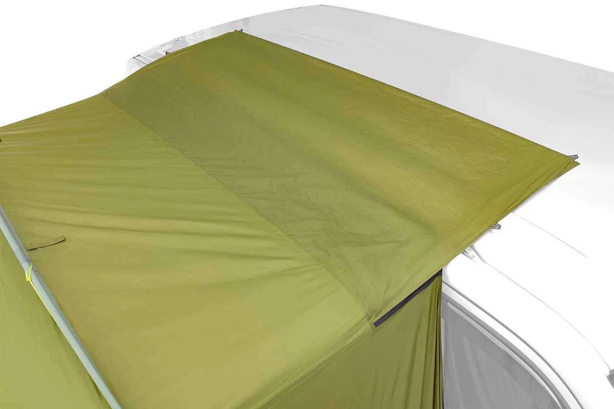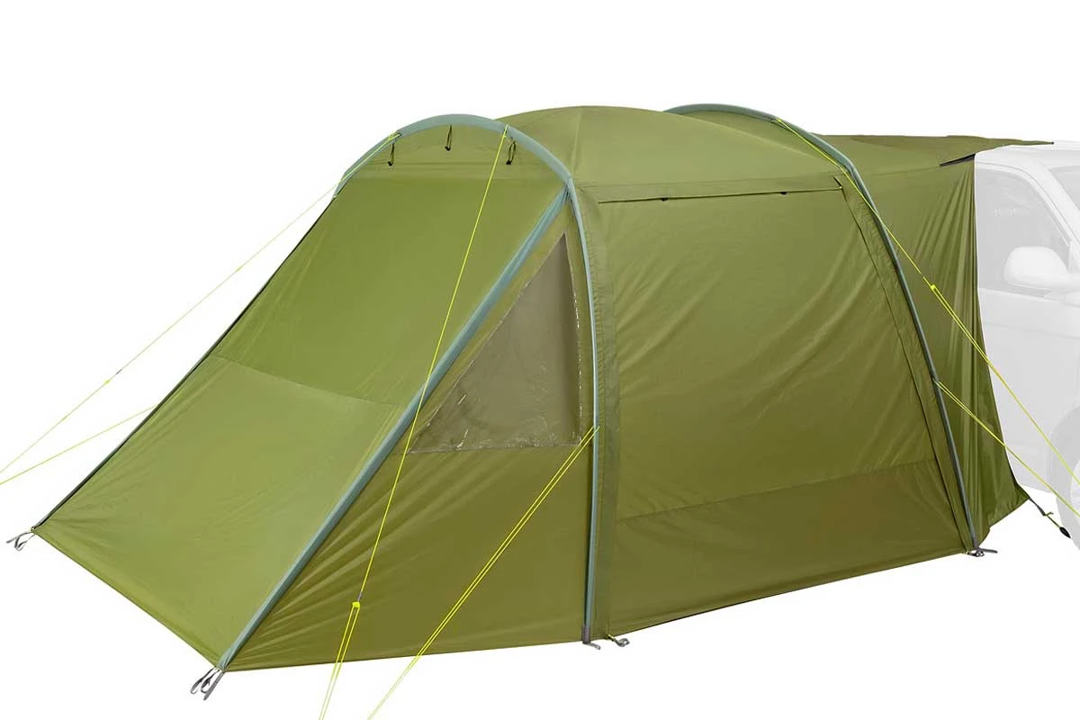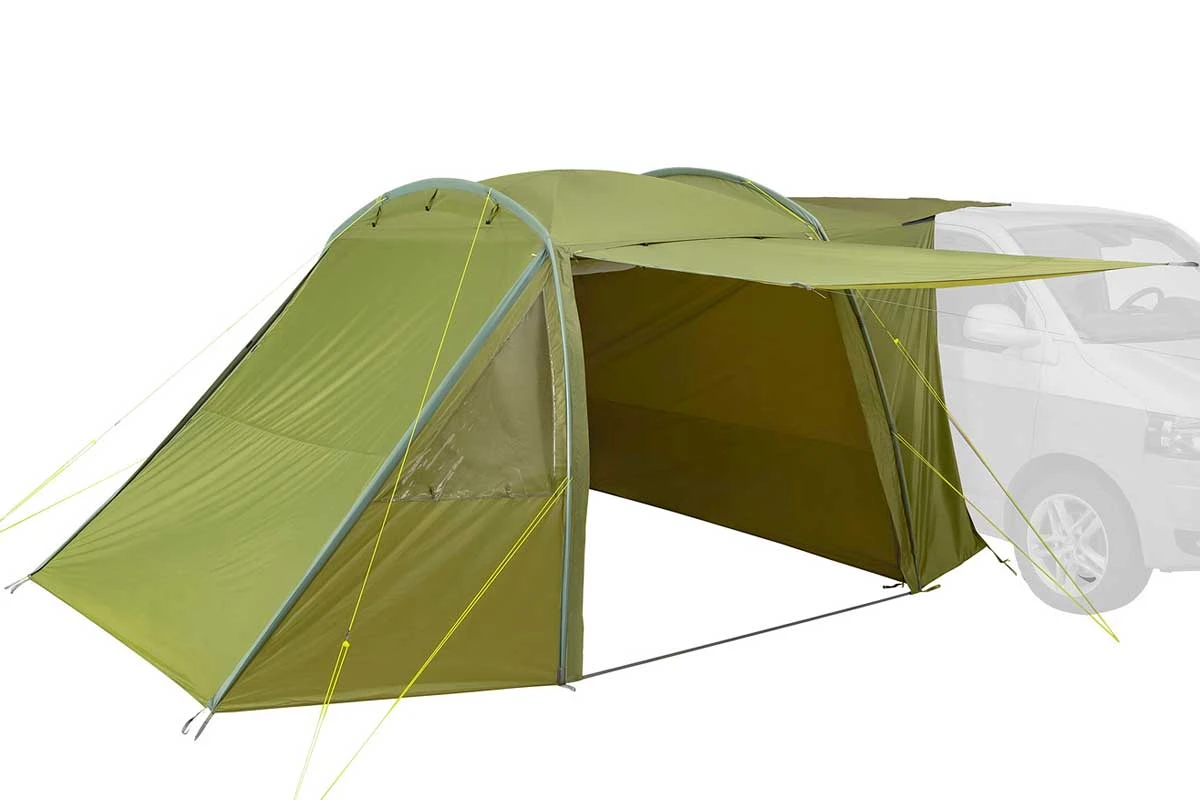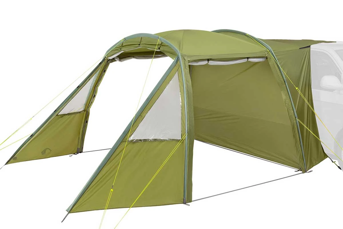 - wird über Keder oder mit Abspannleinen am Fahrzeug befestigt, das damit einen etwa 10m² großen wettergeschützten Vorraum erhält