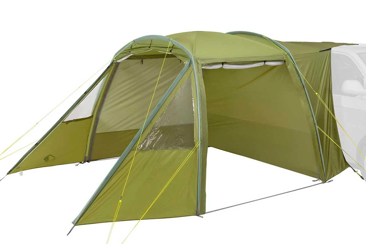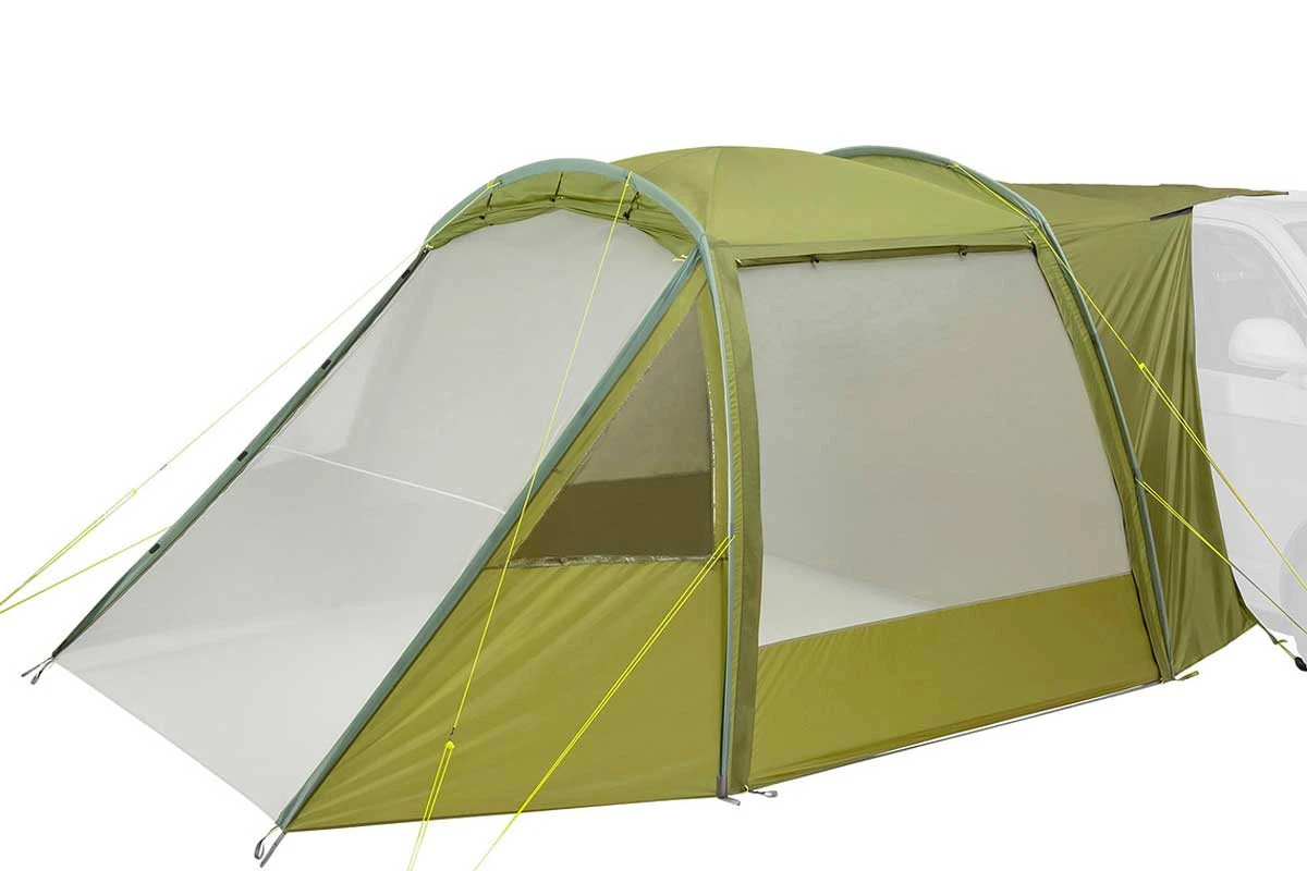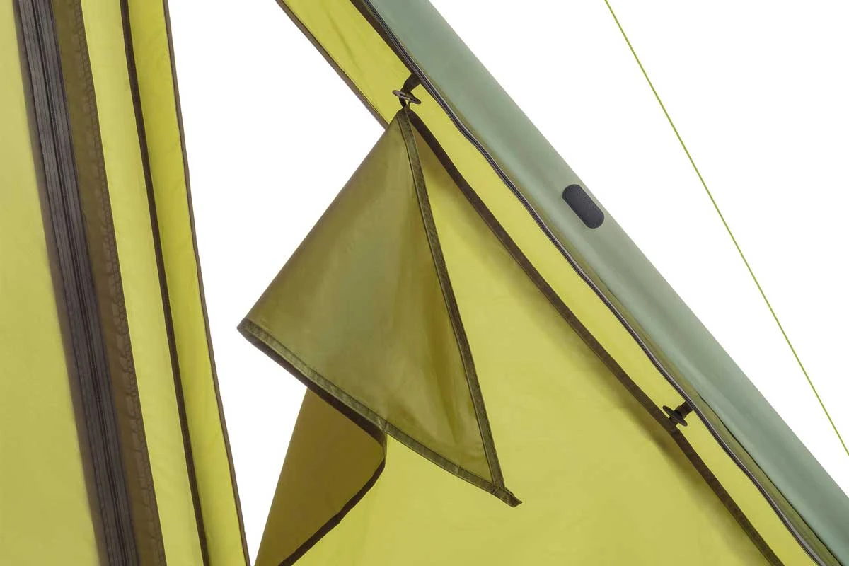 - Frontzugang und beide Seitentüren lassen sich komplett hochrollen, mit optionalen Tarpstangen zu Sonnensegeln aufstellen und/oder mit Moskitonetz verschließen