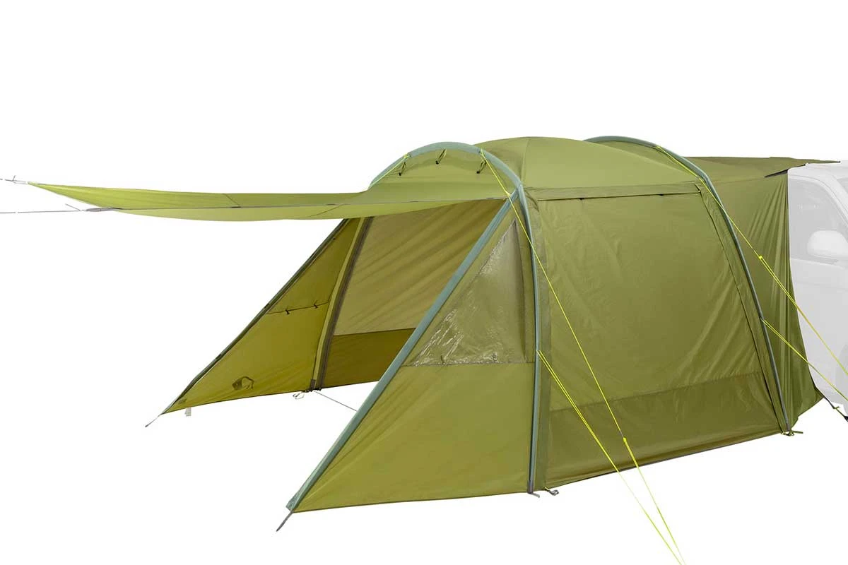Wenn Camping, dann Van Camp. Tatonka gibt dem Busvorzelt Van Camp viel Raum, Stabilität und Flexibilität mit. Das freistehende Vorzelt ist eine Tunnelkonstruktion mit zwei senkrechten Seitenwänden und einem Gestängekreuz im Zelthimmel, der die Windstabilität des Van Camp entscheidend verbessert. Die Anbindung an Campingbusse der unterschiedlichsten Bauart kann über eine Kederverbindung geschehen oder einfach nur durch Abspannen des Schleusendaches über das Auto hinweg. Da das Tatonka Van Camp Ausgänge in drei Richtungen hat, kann man es immer wetter- und/oder blickgeschützt betreten und verlassen. Alle Türen lassen sich für beste Belüftung ohne Insektenplage auch mit Moskitonetztüren verschließen. In diesem Fall kann die wasserdichte Tür über dem Eingang zum Sonnensegel aufgestellt werden (optionale Tarpstangen erforderlich). Selbstverständlich kann der Durchgang zum Fahrzeug verschlossen werden, so dass das Van Camp auf dem Zeltplatz stehen bleiben kann, wenn seine Bewohner einen Tagesausflug mit dem Campingbus unternehmen. Bei tapir gehört die Original Bodenplane zum Lieferumfang des Tatonka Van Camp dazu, so dass Campingmöbel oder Taschen im Vorzelt nicht im Schlamm stehen müssen.
