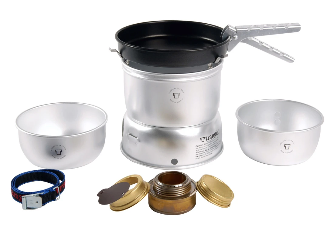 Das All-in-one-Kochsystem aus Schweden in der kleinen Variante für ein oder zwei Personen. Die Sets der Kocherserie 27 benötigen nur ganz wenig Platz im Rucksack, in den Radtaschen oder im Bootssack. In dieser Variante des Sturmkochersets ist der Deckel (Ø 18 cm), der auch als Bratpfanne genutzt werden kann, mit einer Nonstick-Beschichtung ausgestattet. Da machen das Anbraten von Suppen- oder Nudeleinlagen und das Brotbacken doch deutlich mehr Spaß. Der Sturmkocher ist auch bei widrigen Bedingungen schnell und unkompliziert aufgebaut und bleibt standfest, auch wenn es etwas stürmisch ist. Das Aluminium, welches bei den Ultraleicht-Serien von Trangia zum Einsatz kommt, ist aus einer harten und leichten Alulegierung (ca. 25 % Gewichtsreduktion gegenüber normalem Aluminium) gefertigt. Und sollten einmal mehr als zwei Leute mit auf Tour gehen, können die Topf-Halterungen im Windschutz nach oben geklappt werden und größeren Töpfe ausreichend Platz bieten, damit niemand lange warten oder verhungern muss.