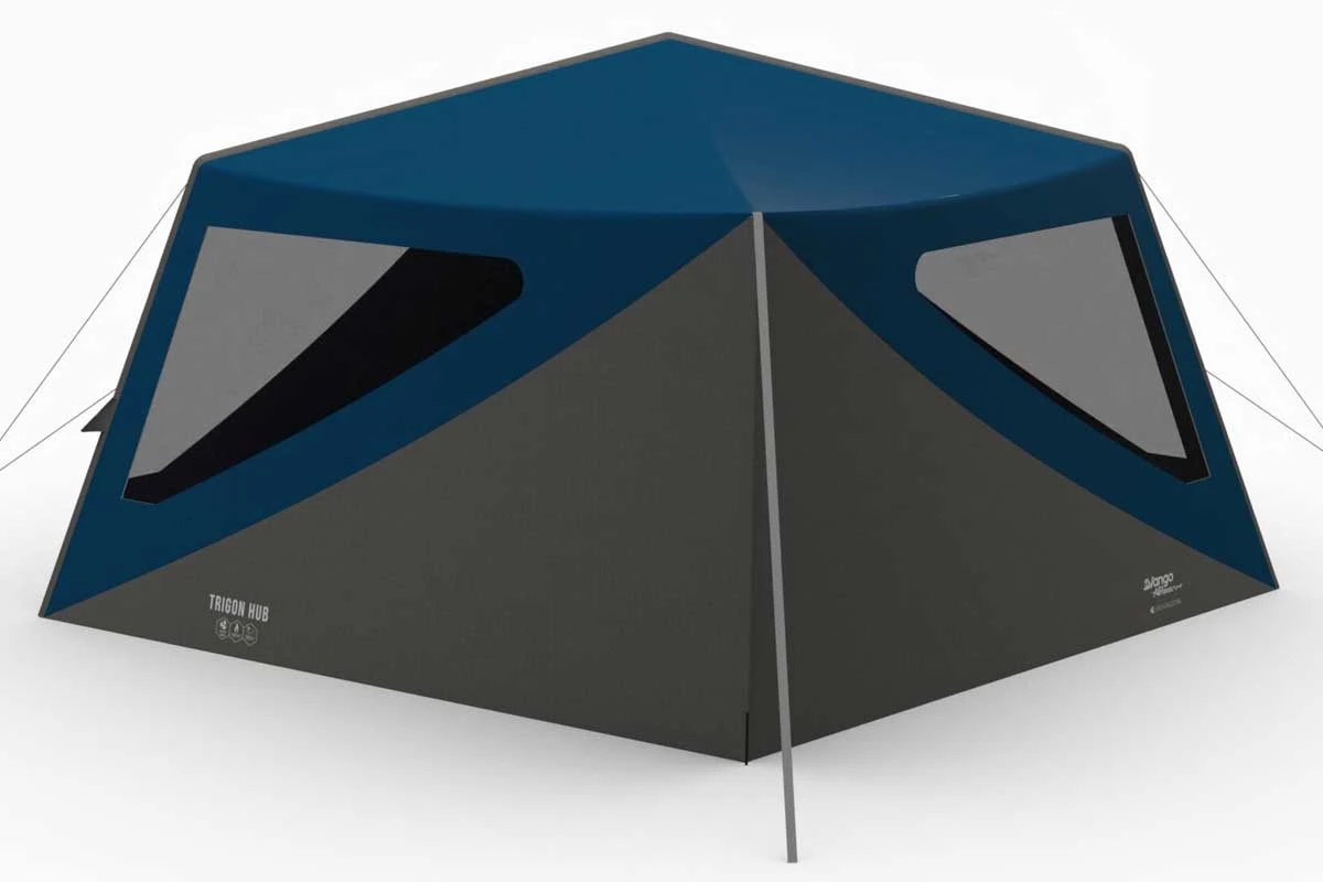 Schöner wohnen. Der Vango Trigon Airhub ist ein Camping-Pavillon, der besonders aussieht, besonders viel Platz bietet und besonders schnell und unkompliziert aufzubauen ist. Letzteres geschieht durch das Aufpumpen des zentralen AirBeam®-Luftschlauches über das leistungsstarke AirSpeed®-Ventil und das anschließende Abspannen von zwei KingPole-Aufstellstangen. Da die mitgelieferte robuste Bodenplane mit den Wänden des Trigon Airhub verbunden werden kann und sich daher beim Errichten der Wände nebenbei aufspannt, ist der Aufbau des großartigen Outdoor-Aufenthaltsraumes in weniger als 10 Minuten erledigt. Jede der vier Seiten des Vango Trigon Airhub lässt sich als Ein- und Ausgang öffnen, so dass dieser immer auf der wetterabgewandten Seite liegen kann. Die vier großen Moskitonetzfenster lassen sich mit winddichten Flaps verschließen, so dass gute Belüftung zwar immer gewährleistet, unerwünschte Zugluft aber vermieden werden kann. Das recycelte Außenmaterial des komfortablen Pavillons ist wasserdicht beschichtet und alle Nähte sind mit Nahtbändern versiegelt, so dass Regen der Aufenthaltsqualität unter dem Pavillon-Dach nichts anhaben kann. Effektiv platzierte Abspannleinen sorgen zudem dafür, dass der Vango Trigon Airhub auch bei Wind sicher und der Familien-Treffpunkt nicht plötzlich ohne Schutz dasteht.