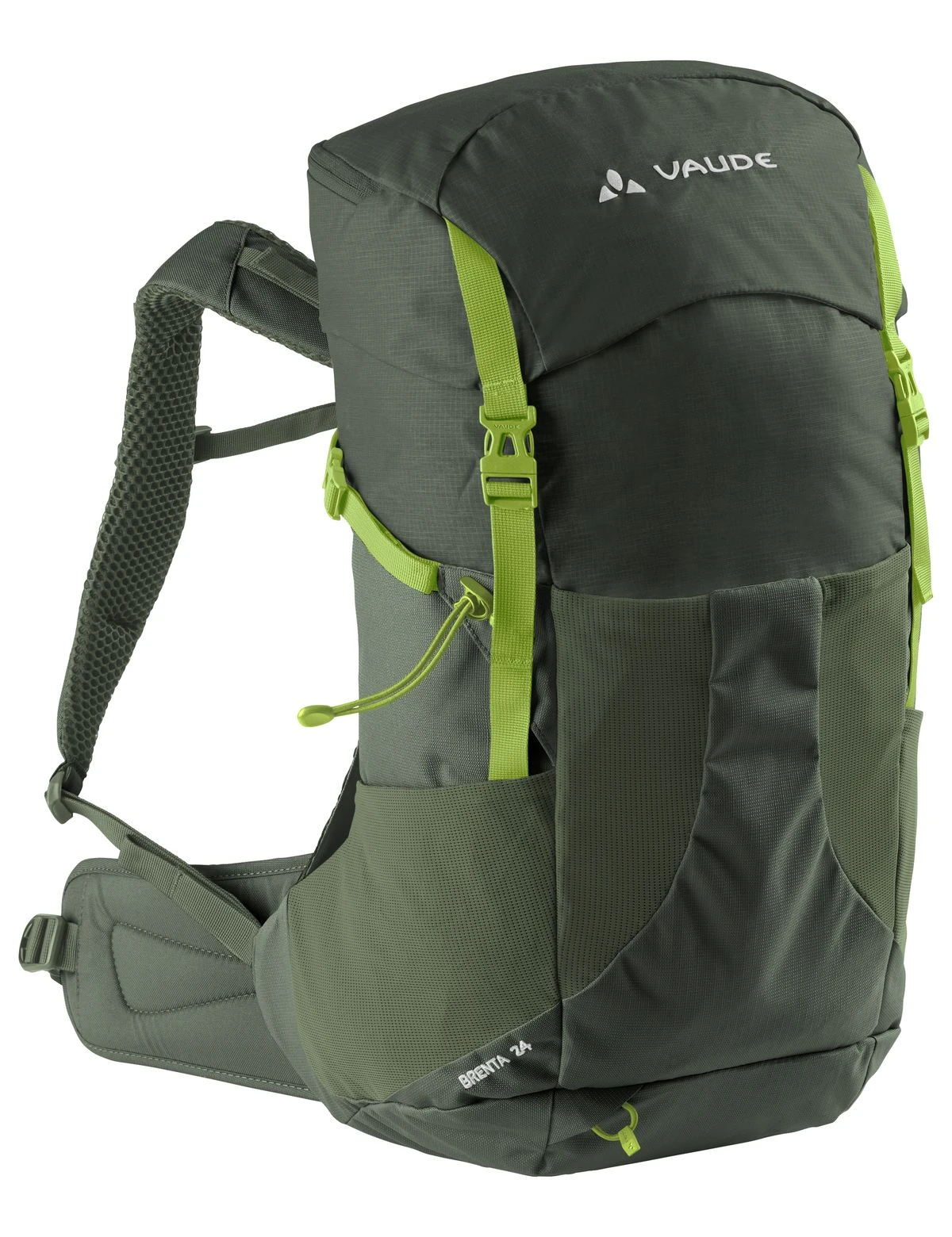 Der Brenta 24 von Vaude ist ein praktischer Tagesrucksack mit 24 Litern Volumen, der mit zahlreichen technischen Raffinessen das Wanderherz beglückt. Er hat das Netzrückentragesystem Aeroflex 3D, mit dem bei perfekter Lastenkontrolle auch immer gute Belüftung gewährleistet werden kann. Die Rückenlänge lässt sich variabel anpassen, was im Bereich der Tagesrucksäcke eher selten vorkommt und den Brenta 24 damit von anderen Daypacks abhebt. Die kompakte Form des Brenta mit dem großvolumigen Packfach, drei Netztaschen außen und zwei geräumigen Reißverschlusstaschen im Deckel bietet großzügigen Stauraum für alles, was auf Tageswandertouren benötigt wird. Die Regenhülle ist im Bodenfach immer griffbereit.