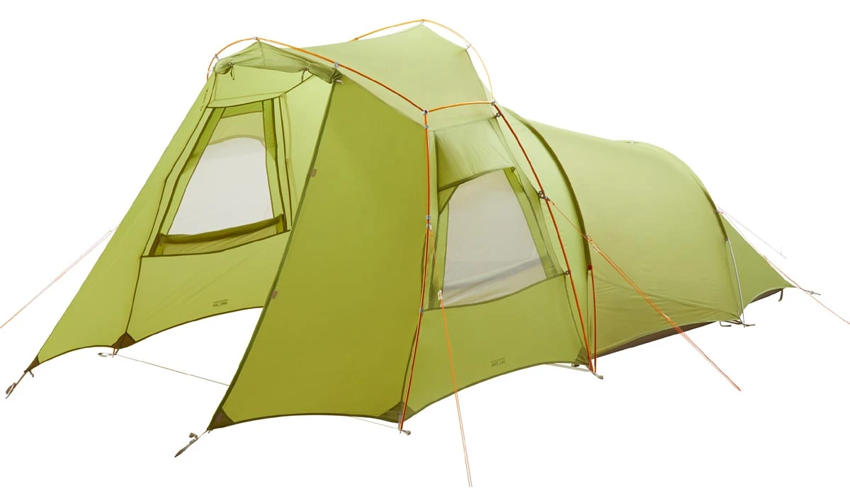 Für den aufrechten Gang! Vaude hat dem Chapel L XT 3P einen Vorraum mit einer Höhe von 170 cm spendiert, sodass man das Tunnelzelt aufrecht betreten kann. Annähernd 4 m² Grundfläche wiederum machen die großzügige Apsis des Chapel L XT 3P sowohl zum komfortablen Speisesaal (mit Tisch und Stühlen) als auch zur Fahrrad-Garage. An diesen wundervollen Eingangsbereich schließt sich nach hinten eine Schlafkabine mit einer komfortablen Länge von 230 cm an, die eine normale Zelt-Sitzhöhe hat (115 cm am höchsten Punkt). Vaude charakterisiert das Chapel L XT mit dem Zusatz “3P” als 3-Personen-Zelt und bei einer Innenzelt-Breite von 165 cm passen auch drei 51 cm breite Matten in die Schlafkabine. Wer allerdings den Komfort des Chapel L XT 3P voll ausnutzen möchte, sollte es als 2-Personen-Zelt nutzen. Bei einem Gewicht von 4.200 g ist das sicher nichts für den Rucksack – auf dem Fahrrad oder im Boot aber kein Problem! Bei der Konstruktion hat Vaude beim Chapel L XT 3P auf einen möglichst leichten Aufbau viel Sorgfalt verwendet. Das stabile Gerüst des hohen Vorraums besteht aus vier Gestängebögen, von denen zwei für besseres Handling bereits vorgebogen sind. So müssen an keiner Stelle rohe Kräfte walten und das Außenzelt kann problemlos in des robuste Aluminiumgestänge eingeklippt werden. Der Schlafbereich ist ein Standard-Tunnelzelt mit zwei am Außenzelt verlaufenden Gestängekanälen. So sichert Vaude, dass das Innenzelt beim Auf- und Abbau eingehängt bleiben kann und so immer vor Wetter geschützt ist. Die beiden großen Moskitonetz-Fenster im Vorraum lassen sich komplett verschließen, können aber im “Lüfter-Modus” auch bei Regen geöffnet bleiben, da sie mit einem kleinen, effizienten Wetterdach geschützt sind. Auch der Dachlüfter am Ende der Schlafkabine ist wettergeschützt und trägt zur insgesamt guten Belüftbarkeit des Chapel L XT 3P bei.