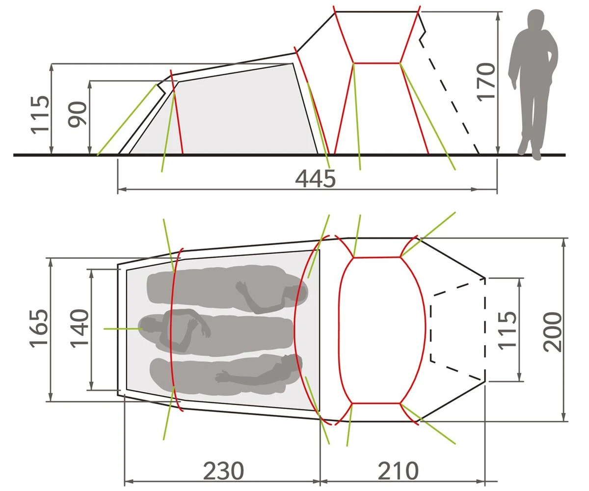- Tunnelzelt für 2-3 Personen mit 170 cm hohem Vorraum