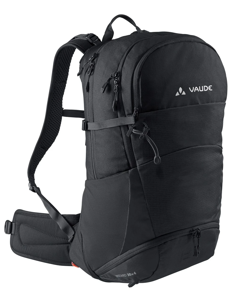 Wenn man davon ausgeht, dass Vaude den Wizard 30+4 nach dem englischen Wort für Hexenmeister oder Zauberer benannt hat, dann muss ja wohl was dran sein. Ist es auch! Sogar jede Menge: Das “+4” im Namen des Wizard 30+4 steht für die Literanzahl Volumen, die durch einen um den Packsack laufenden Reißverschluss dem Grundvolumen von 30 Litern hinzugefügt werden kann. Einstellbar ist auch die Länge der Schultergurte und damit die Rückenlänge. Diese können über einen Klettverschluss an der Rückeplatte von der Größe S bis XL individuell eingestellt werden. Ebenso verhält es sich mit der Netzbelüftung des Tagesrucksacks. Je nach Belüftungsbedarf und gewünschtem Packvolumen kann die Rückenplatte verformt werden – je nachdem, ob mehr Belüftung oder ein körpernaher Sitz gewünscht ist. So ist auch ein schweißtreibender Aufstieg ein Klacks. Die Fronttasche des Rucksacks verläuft über die gesamte Fläche und bietet zusätzlichen Stauraum. Der vorhandene Stauraum unterteilt sich durch ein separates Bodenfach, sodass die Ausrüstung sortiert werden kann. Der Daypack lässt sich aber auch ohne Trennung und dadurch mit einem größeren Hauptfach nutzen. Die Regenhülle reist in einem Bodenfach griffbereit mit, das Material ist aber ohnehin wasserabweisend beschichet und hält somit den ein oder anderen Tropfen ab. Damit ist der Wizard 30+4 von Vaude ein toller Begleiter für Wanderungen, anstrengende Gipfeltouren oder auch im Alltag und auf längeren Reisen als Ergänzung zur Reisetasche.