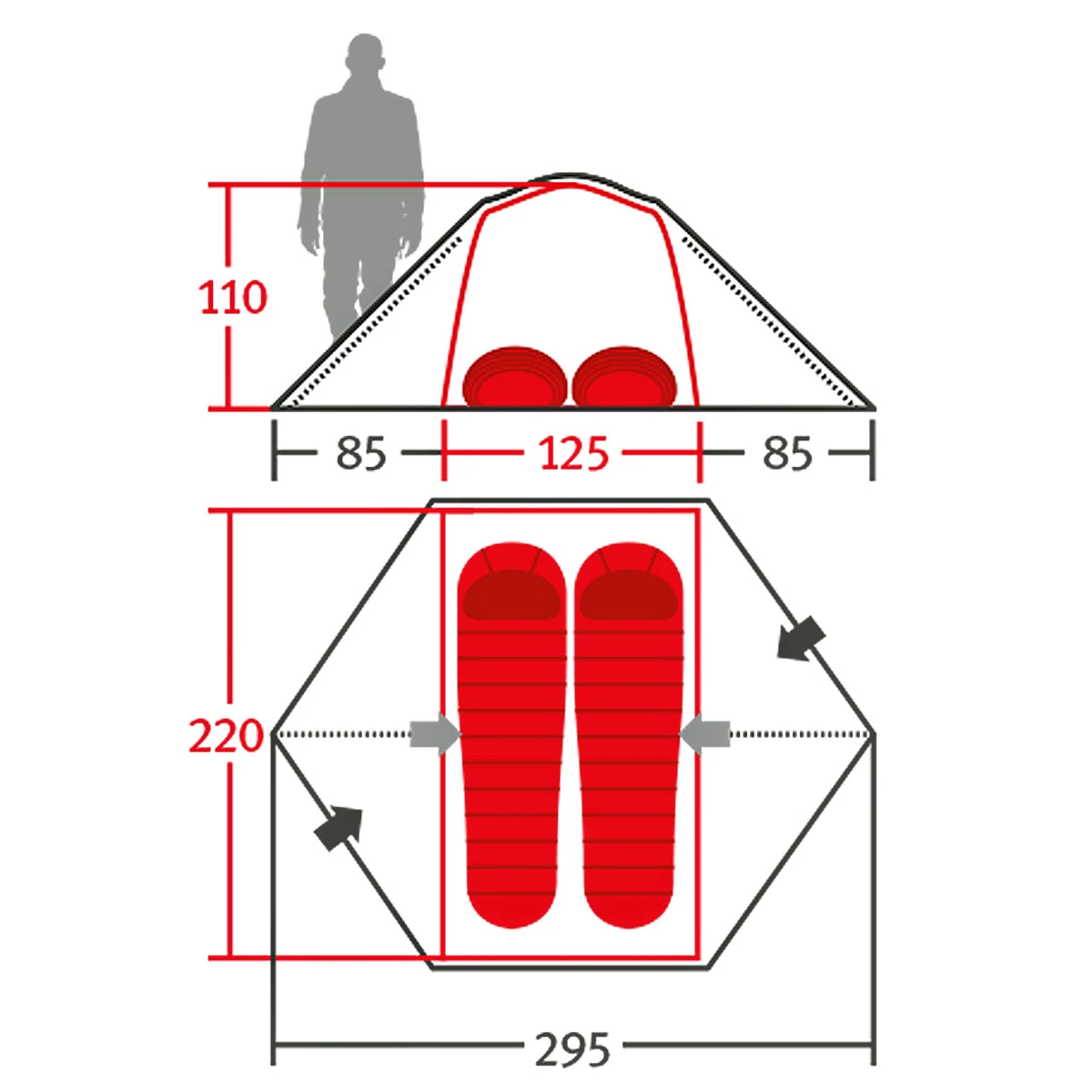 - Kuppelzelt für 2 Personen mit zwei Eingängen und zwei Vorräumen