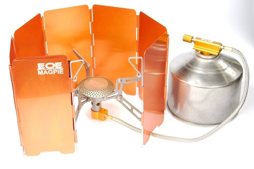 Der Windschutz Magpie von Eifel Outdoor Equipment (EOE) besteht aus 9 miteinander verbundenen Aluminium-Segmenten und ist hervorragend für alle am Boden stehenden Kocher geeignet, die nicht auf Kartuschen aufgesetzt werden. Mit einem Gewicht von 112 g ist ist er vergleichsweise leicht und findet dank der gefalteten Konstruktion in jedem Rucksack Platz.